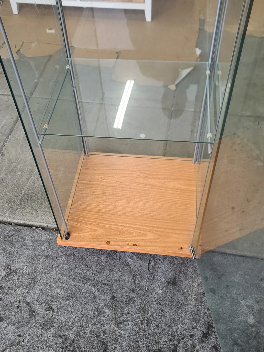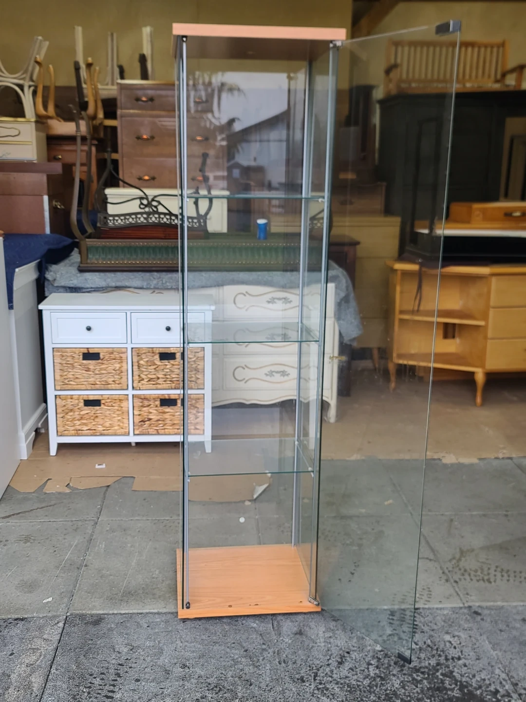 Beautiful glass display cabinet with a light wood trim. It features multiple glass shelves, perfect for displaying your collectibles or other items. It's in good condition and ready to use in your home or office! Measurements to follow. Delivery can be arranged. Viewing and pickup by appointment.