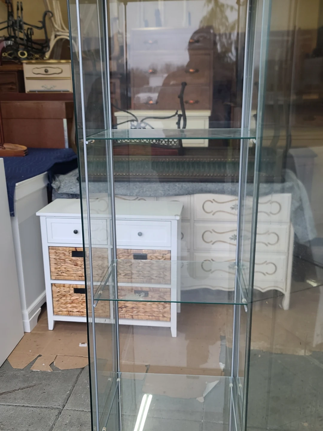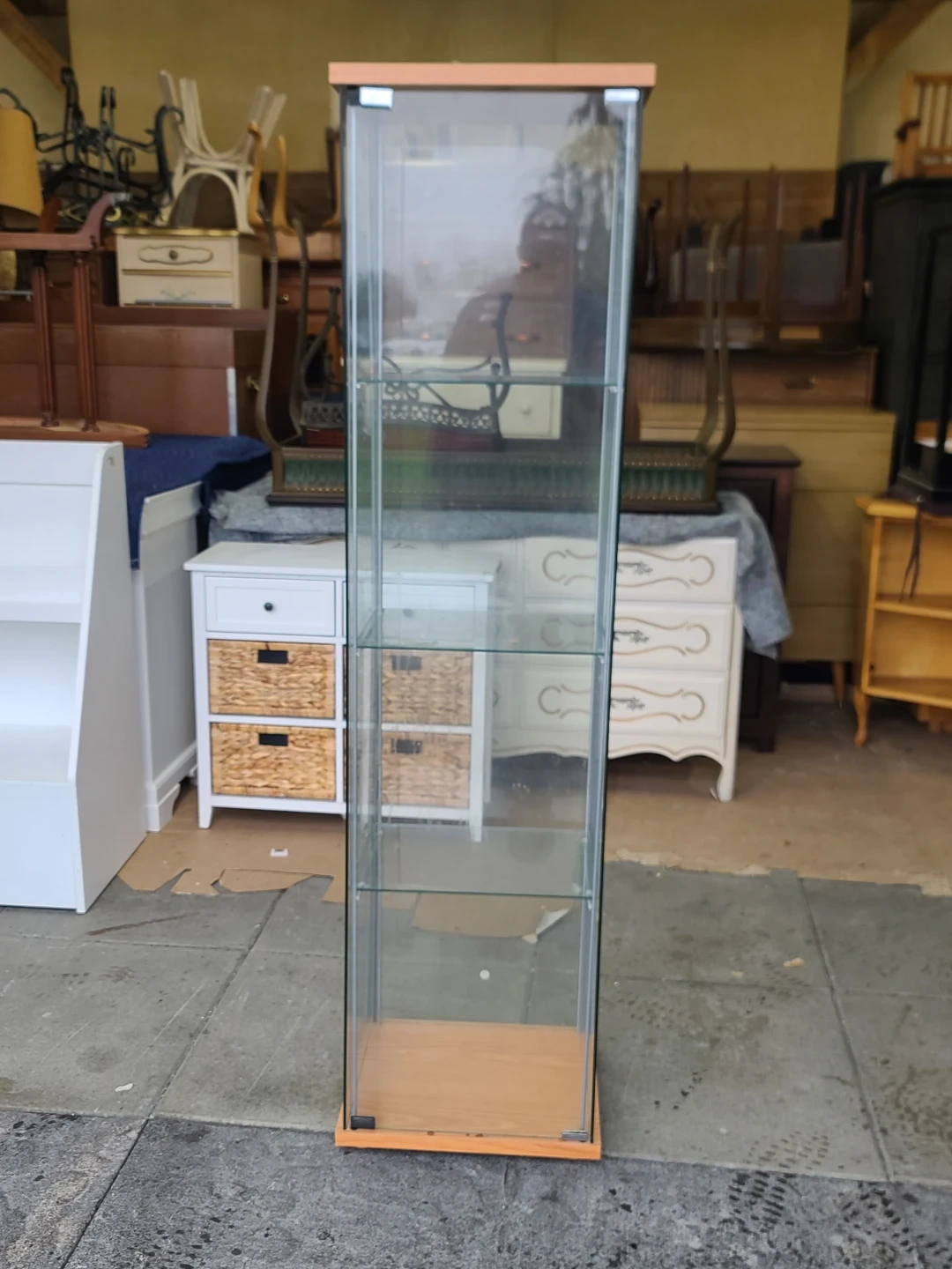 Beautiful glass display cabinet with a light wood trim. It features multiple glass shelves, perfect for displaying your collectibles or other items. It's in good condition and ready to use in your home or office! Measurements to follow. Delivery can be arranged. Viewing and pickup by appointment.