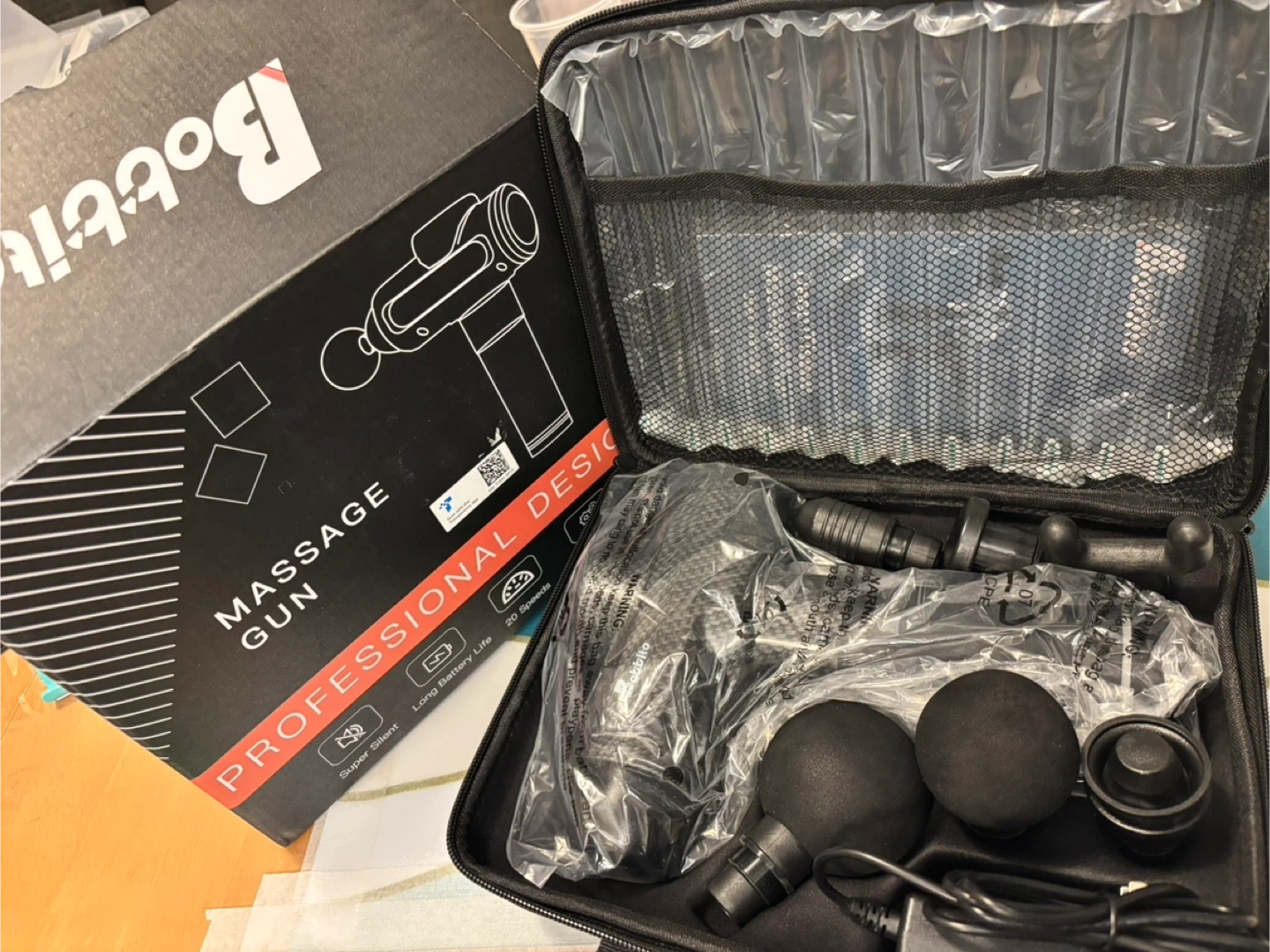 Bobbie massage gun with a professional design! It comes with a carrying case and all the attachments. It's super silent, has a long battery life, 20 speeds, and strong power. The box is included too