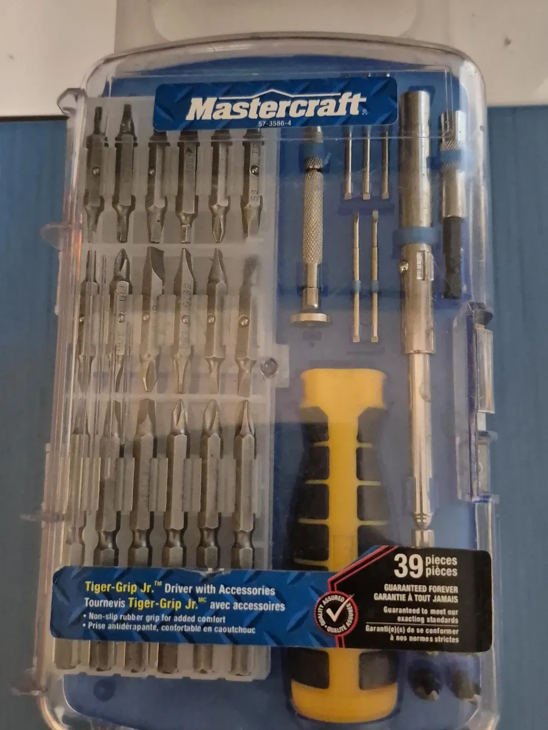 Selling a Mastercraft Tiger-Grip Jr. Driver with Accessories set. It comes with 39 pieces and has a non-slip rubber grip for added comfort.