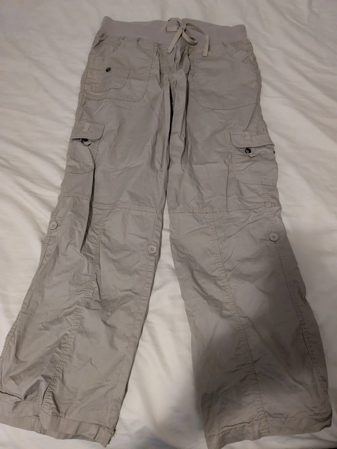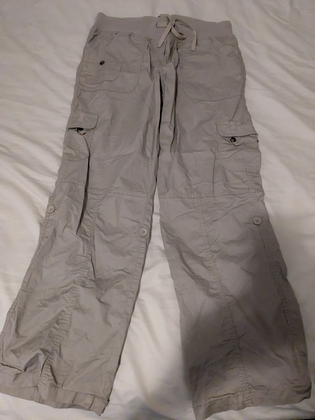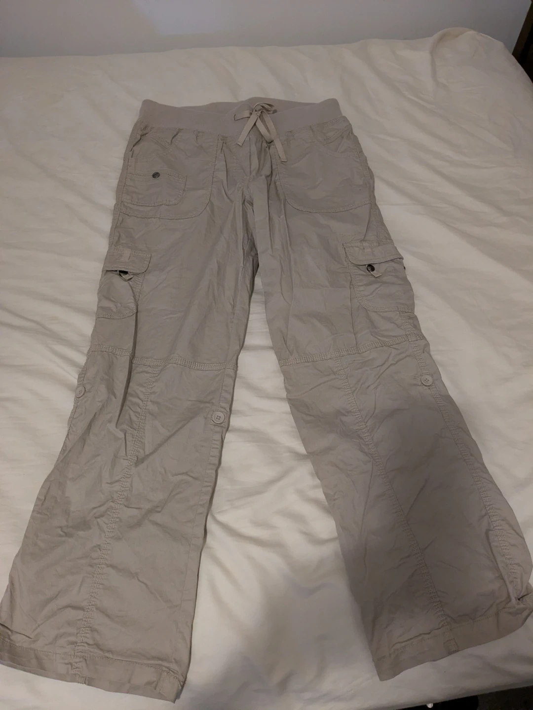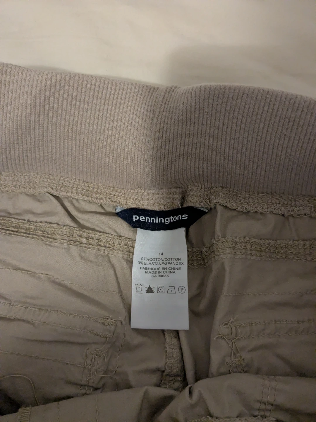 Comfy Penningtons cargo pants in a neutral beige colour! They're size 14 and made of 97% cotton and 3% spandex, so they have a bit of stretch. Great for everyday wear!