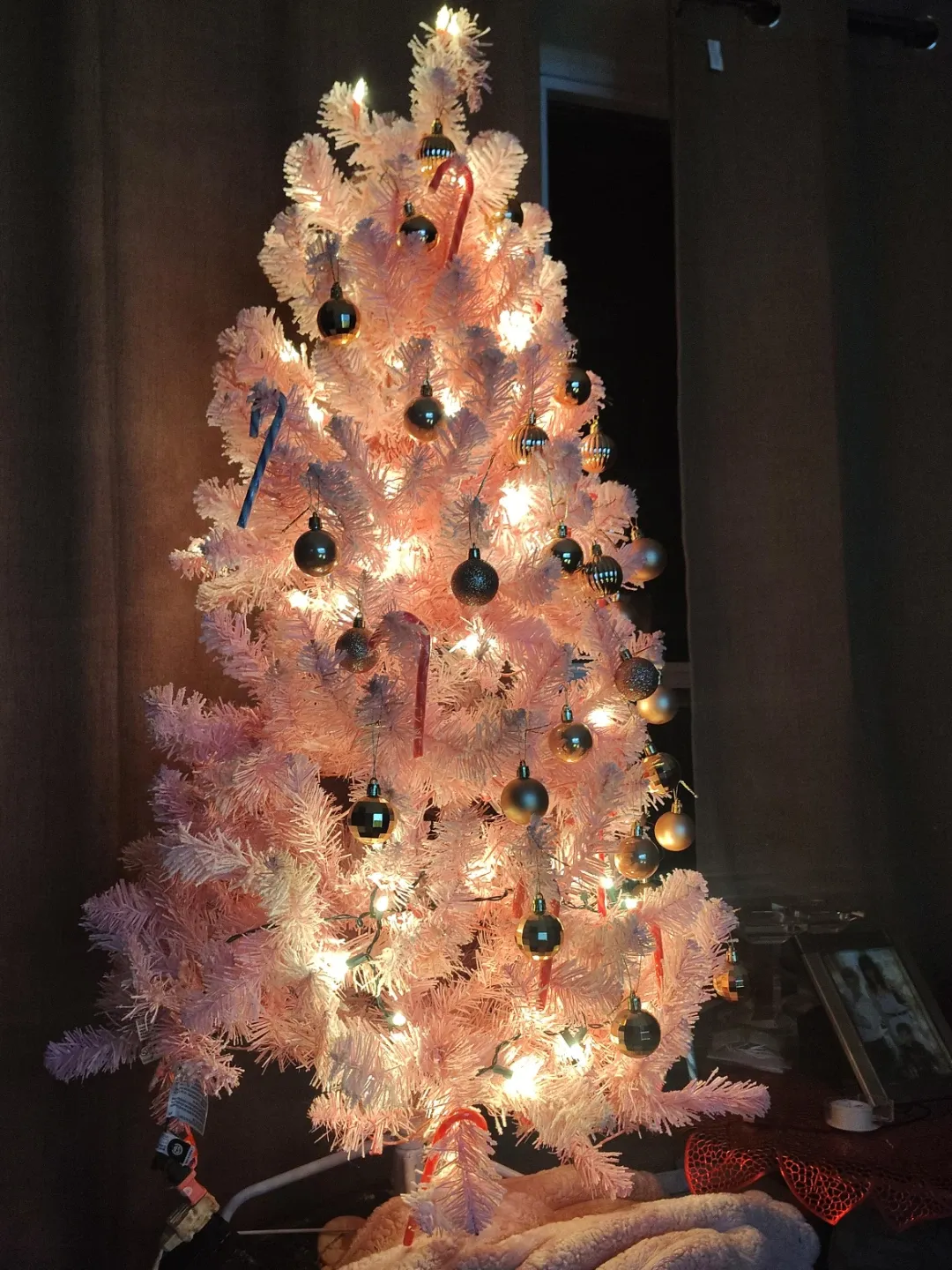 Selling a cute pink Christmas tree, complete with ornaments and lights! It's perfect for adding a festive touch to any room during the holidays