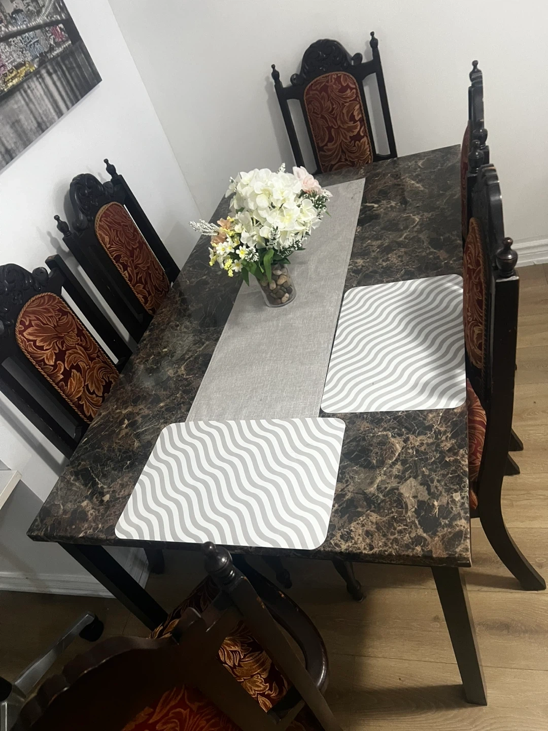 Selling a dining table without the chairs. The table has a marble-like finish on top, and the four foot of the table is black. It would be a great addition for a family with a dining room!