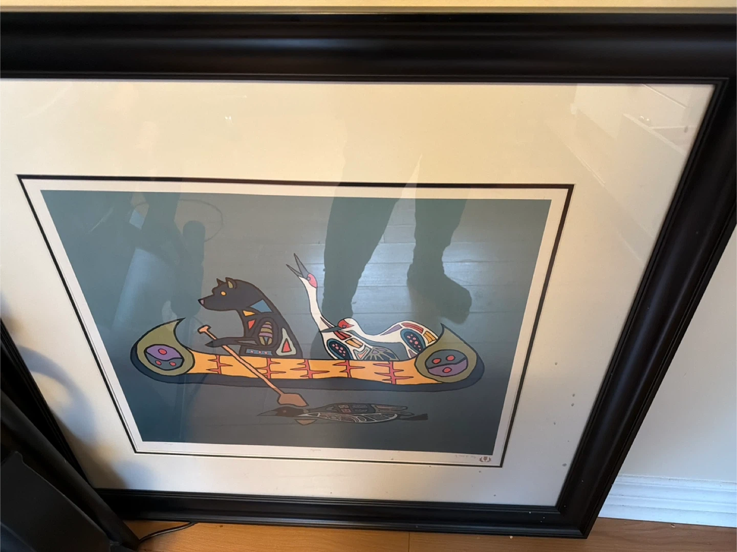 Selling a framed print featuring indigenous artwork. The print depicts a canoe with animal figures. It's a lovely piece for adding some cultural flair to your home!