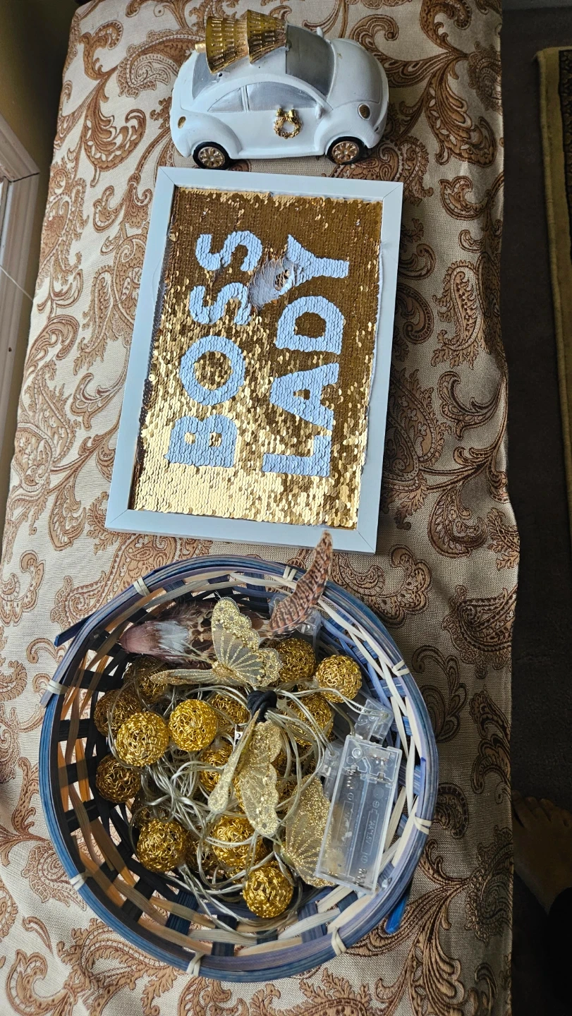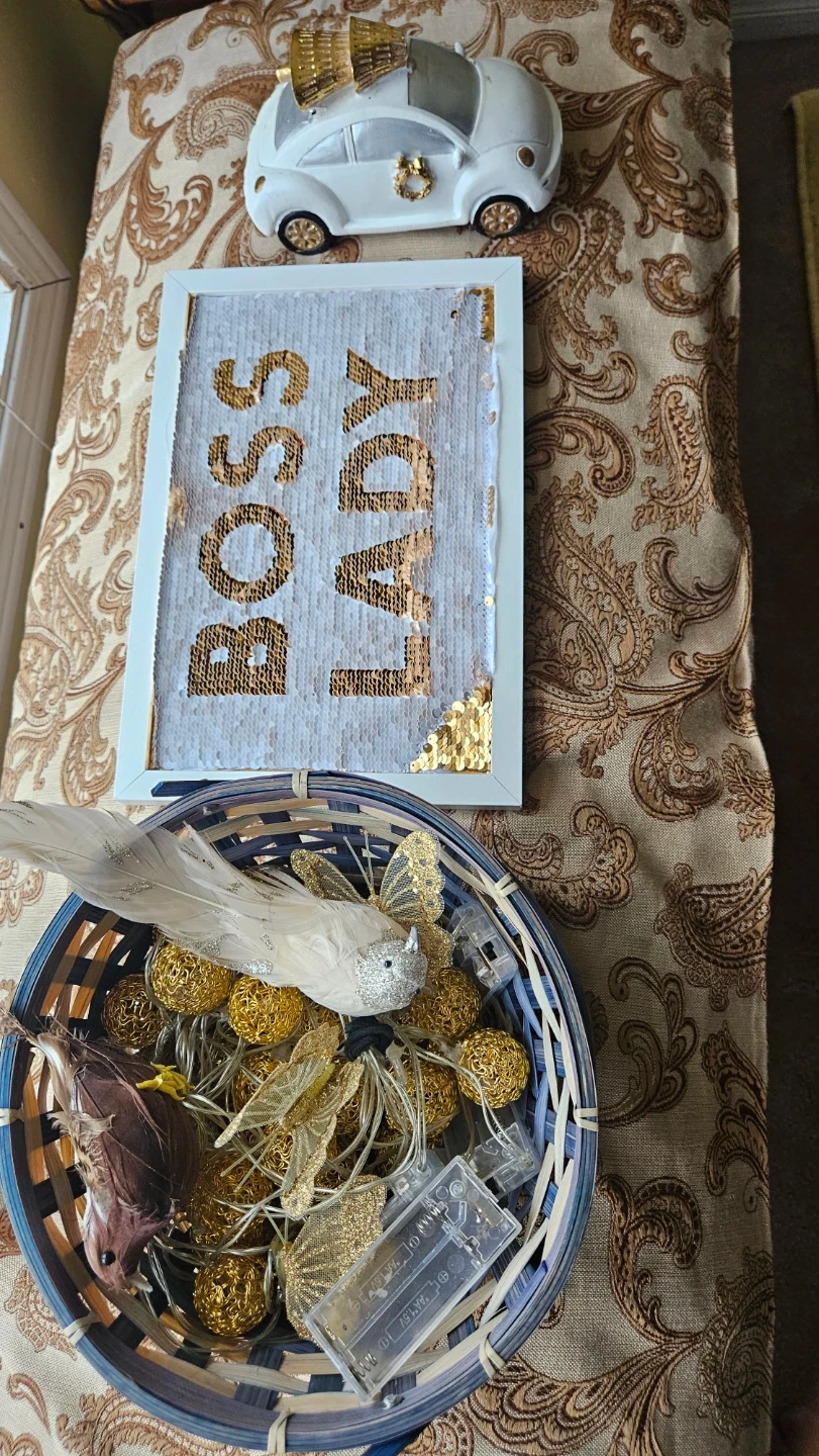 A collection of home decor items including a framed sequin sign that says "Boss Lady", a decorative car, and a basket of decorative lights and ornaments