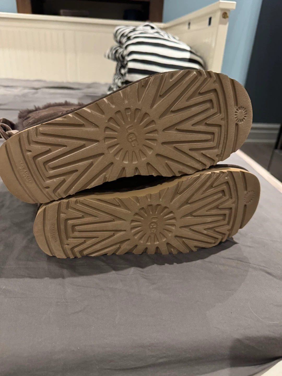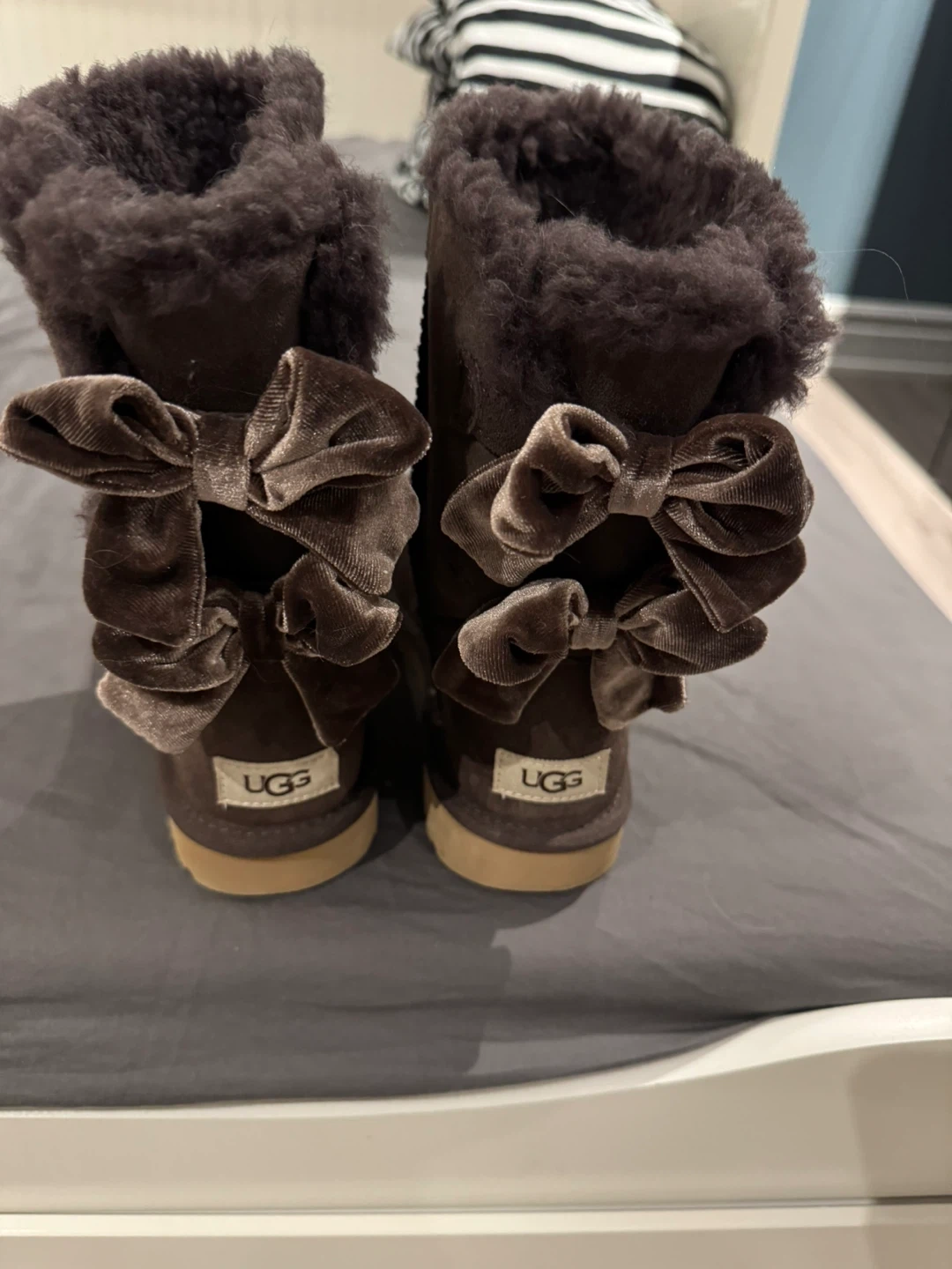 Selling a pair of UGG boots in a lovely brown colour! They're a size US 8. The boots have cute bows on the back. Perfect for keeping your feet warm and cozy during the colder months!