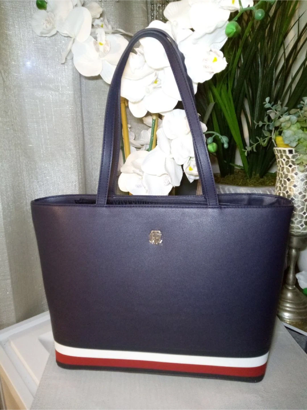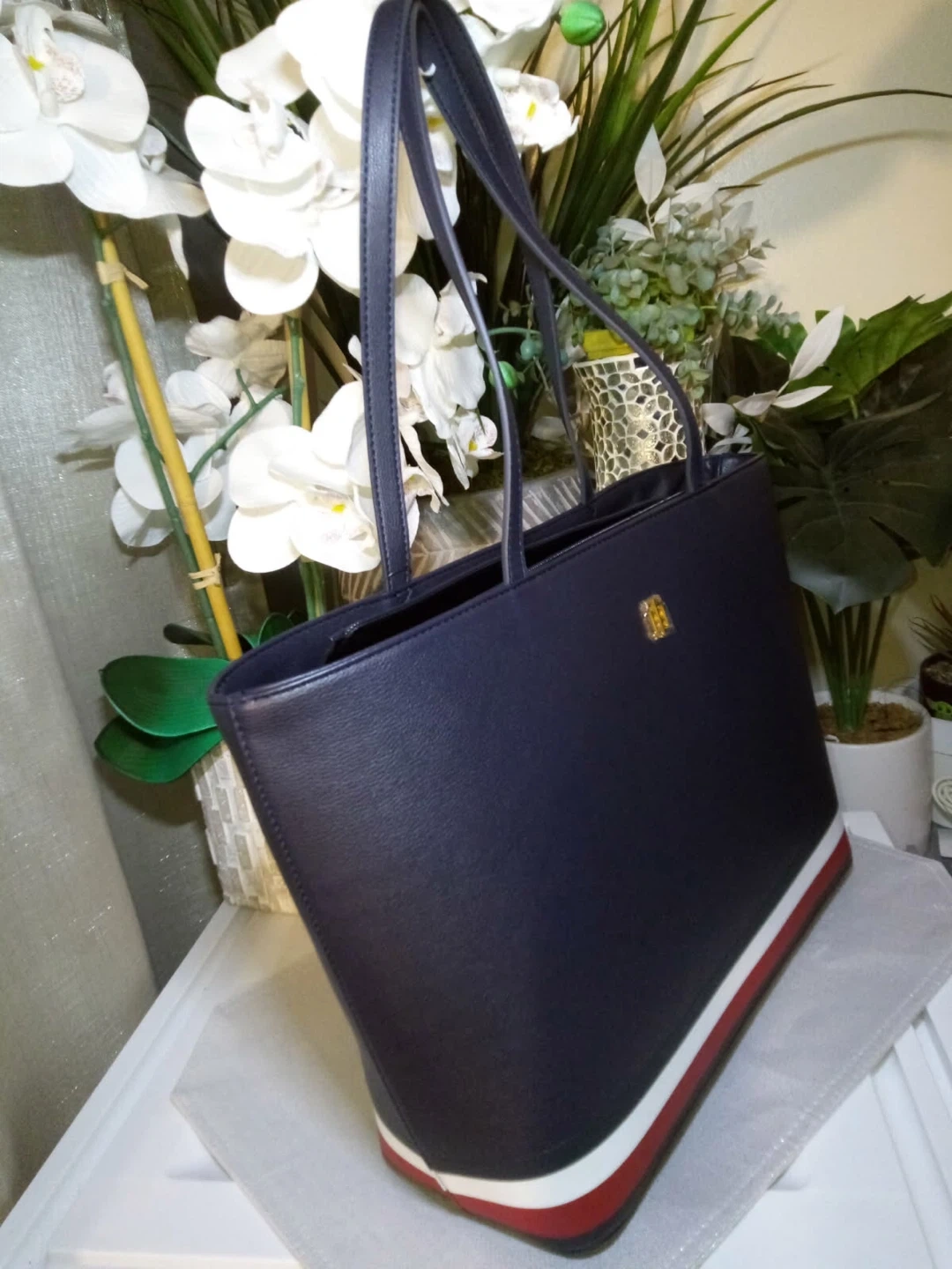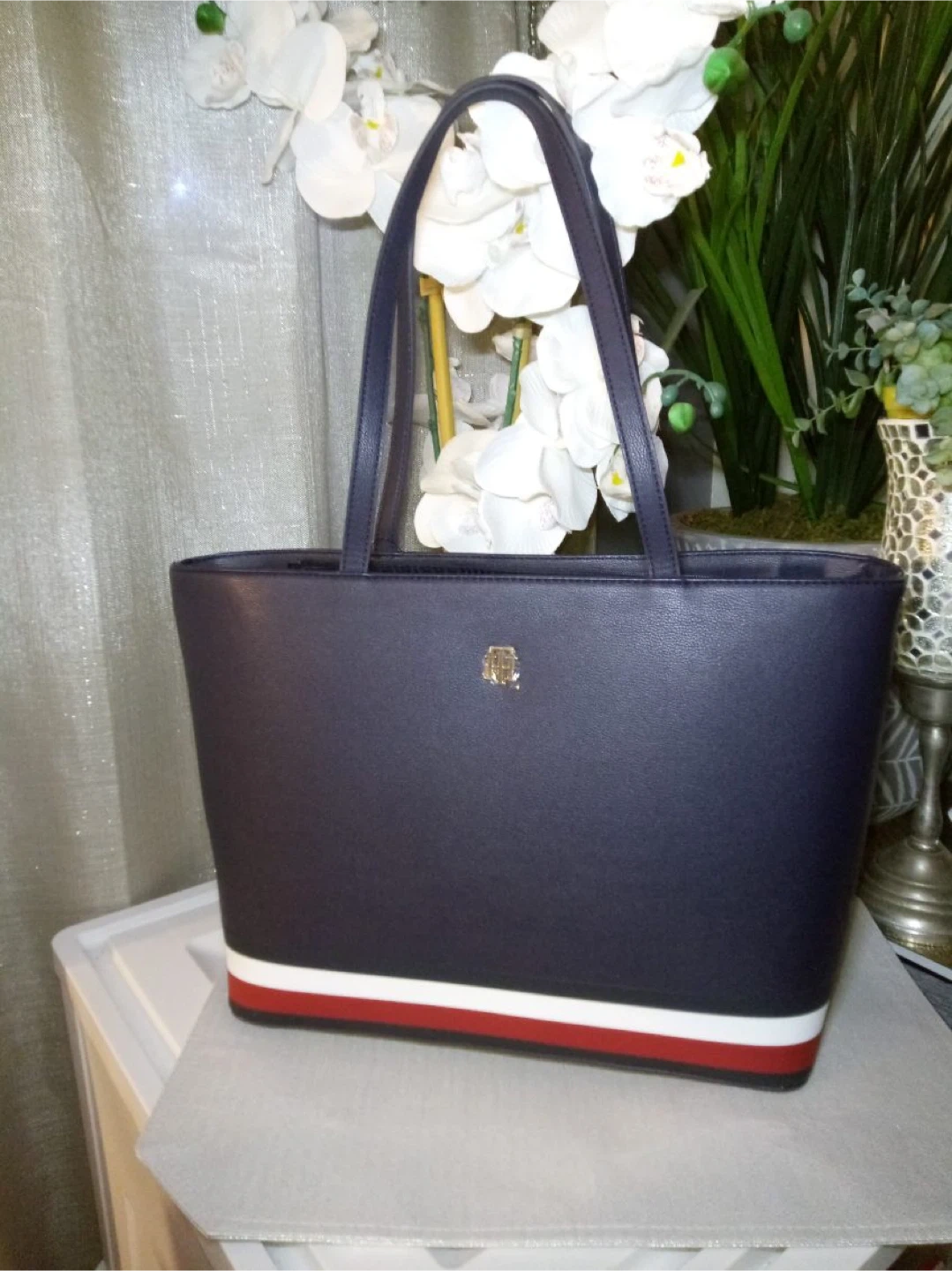 Check out this brand new Tommy Hilfiger tote bag! It's a beautiful navy blue color with the classic red, white, and navy stripe detail. The tag shows the original price was $119.00