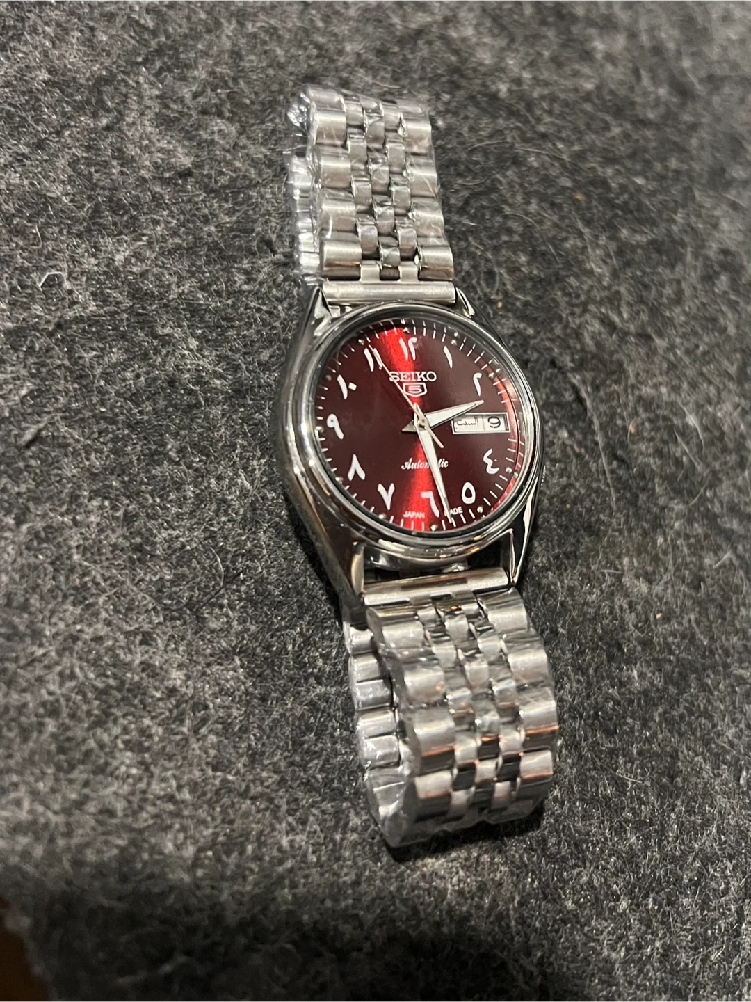 Selling a Seiko 5 automatic watch with a striking red dial featuring Arabic numerals. 100% authentic. Excellent condition. Bought for husband but it wasn’t his style.