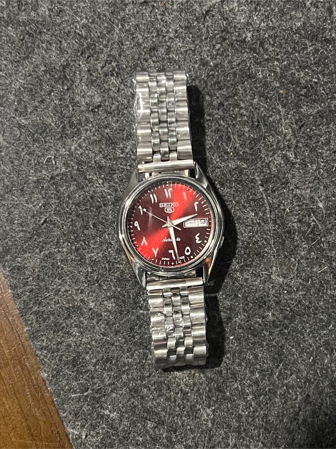 Selling a Seiko 5 automatic watch with a striking red dial featuring Arabic numerals. 100% authentic. Excellent condition. Bought for husband but it wasn’t his style.