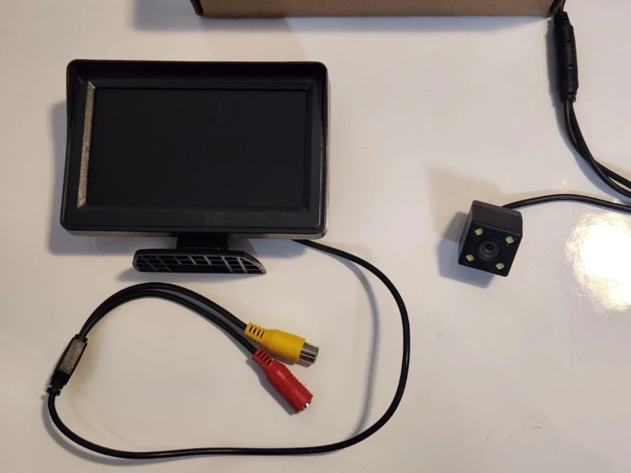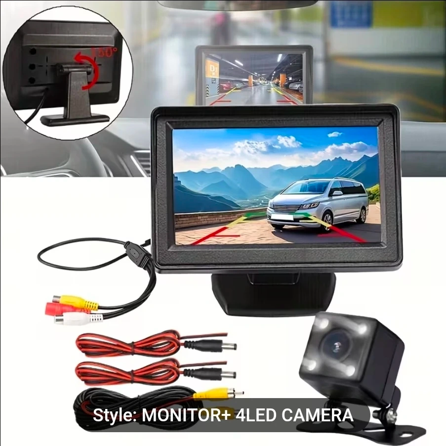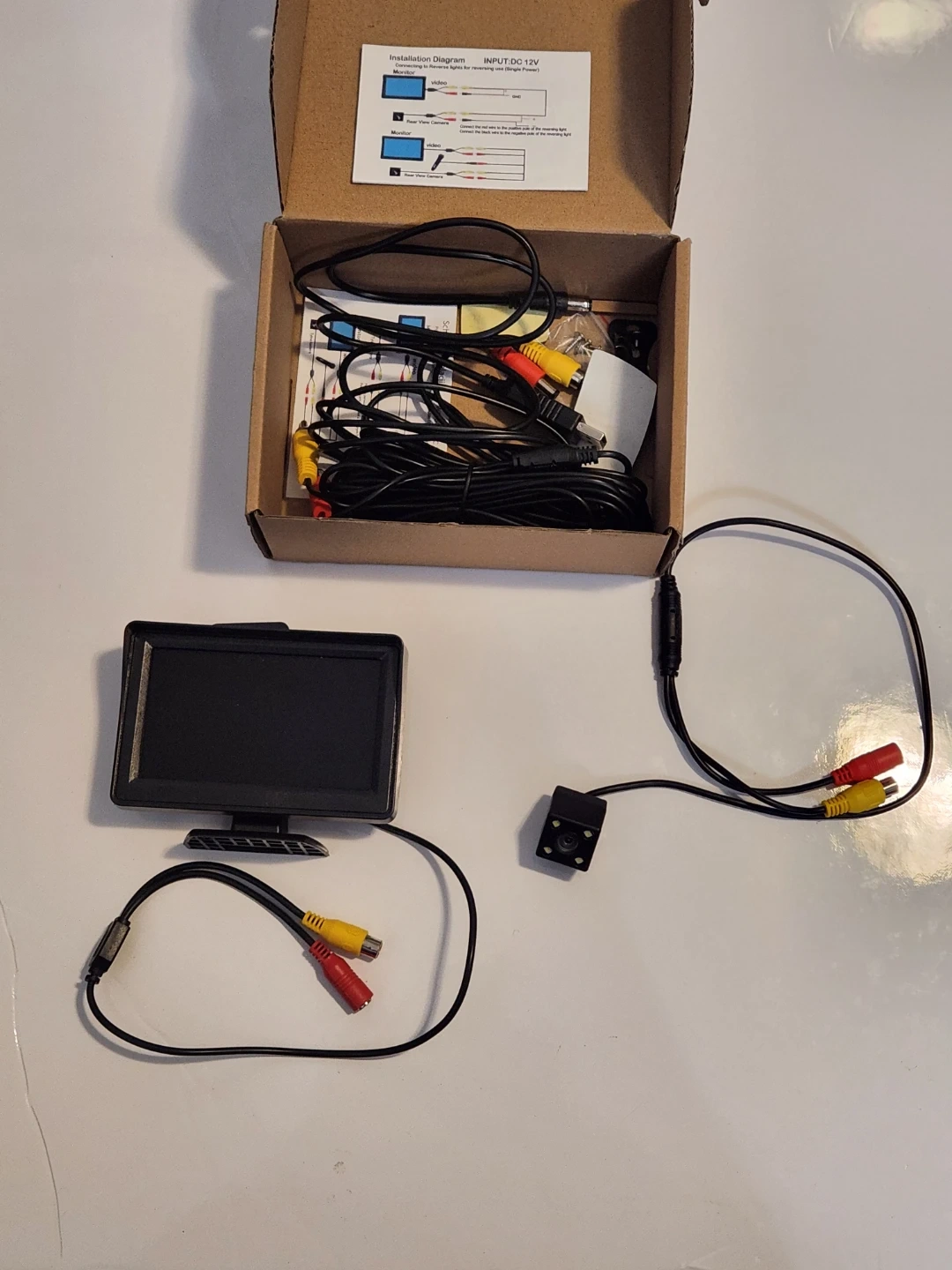 Selling a car backup camera set that includes a monitor and a camera with 4 LEDs. It comes with all the necessary cables and the original box. Great for improving your car's safety and visibility while backing up!