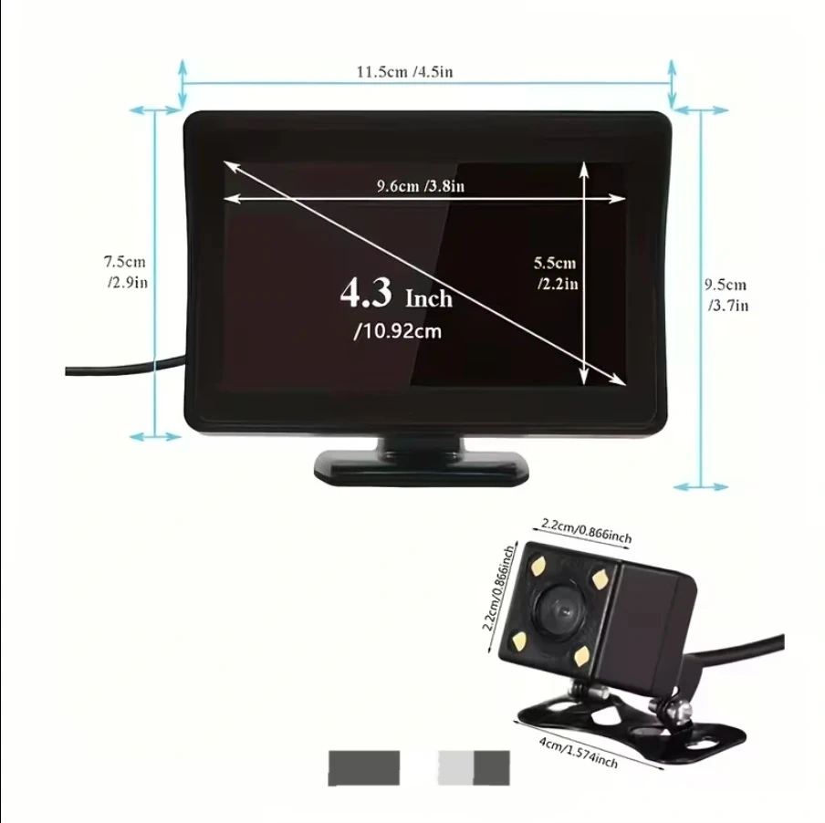 Selling a car backup camera set that includes a monitor and a camera with 4 LEDs. It comes with all the necessary cables and the original box. Great for improving your car's safety and visibility while backing up!