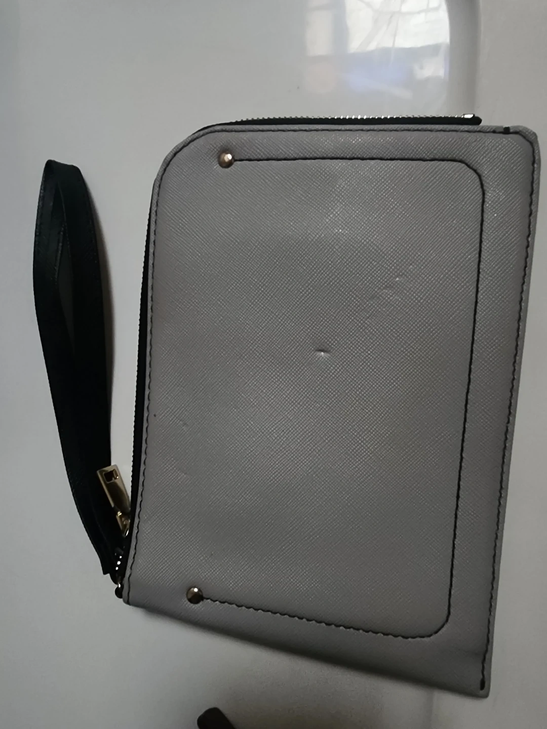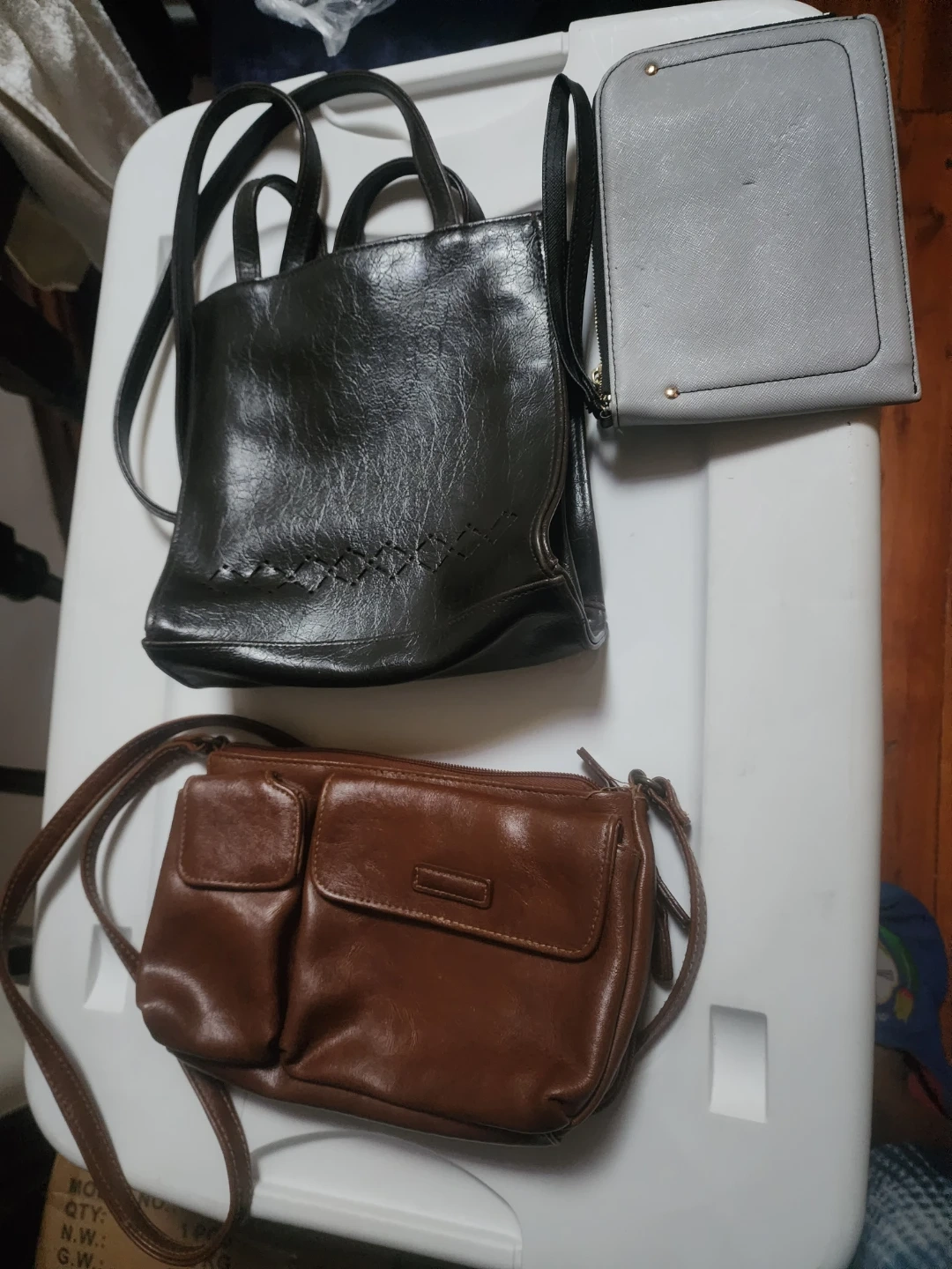 Selling a collection of used leather purses and handbags. There's a gray wristlet, a dark brown (almost black) shoulder bag. In good but used condition, as pictured.