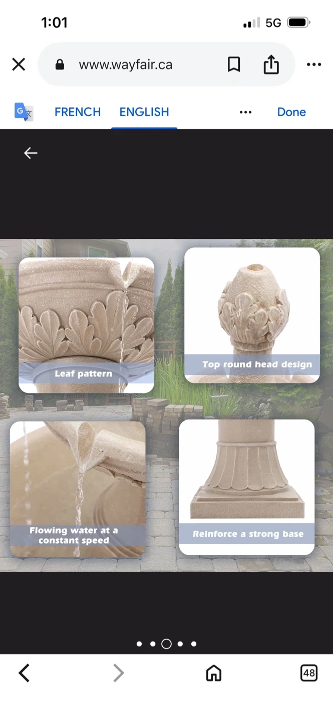 This outdoor water fountain features a classic three-tier design. It has a leaf pattern and a top round head design. The base is reinforced for stability. It's designed to allow water to fall centrally and prevent water from splashing out, flowing water at a constant speed