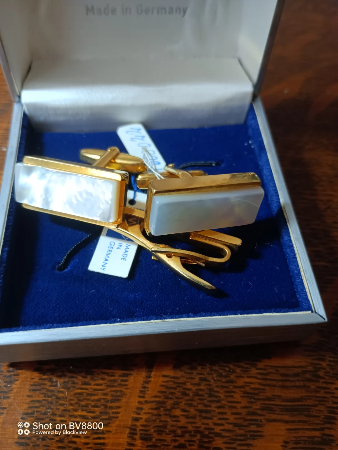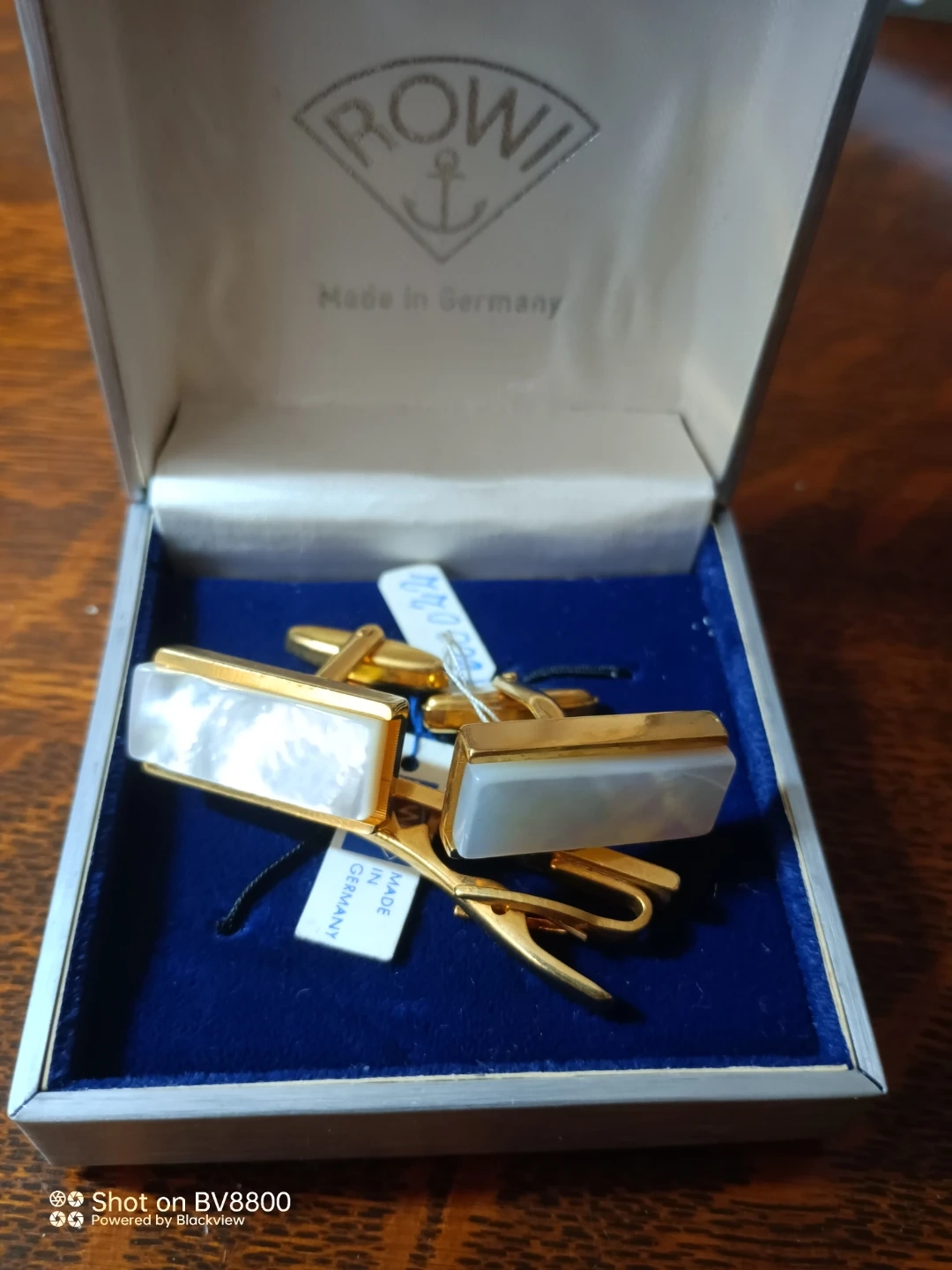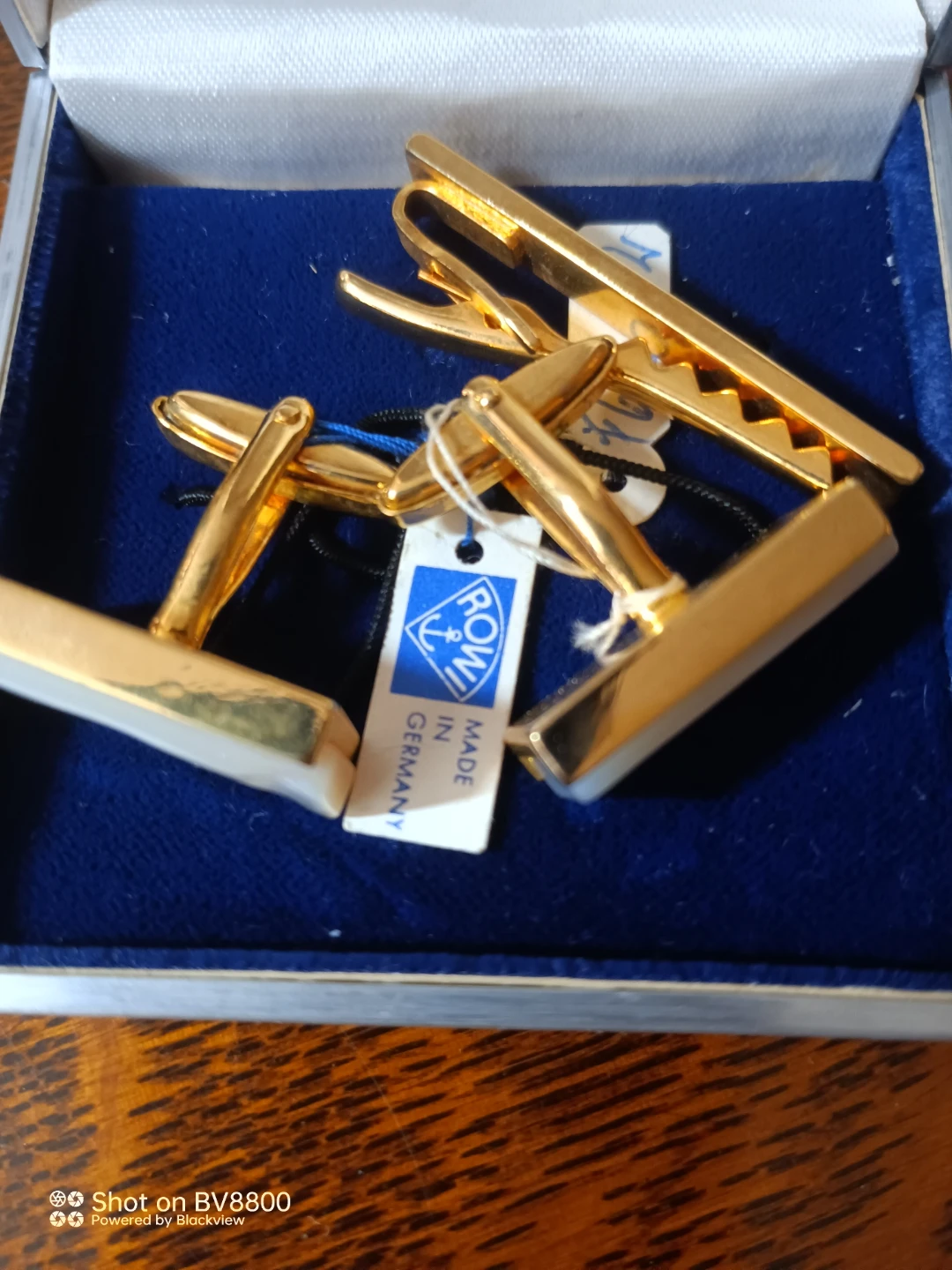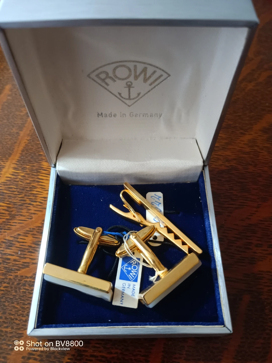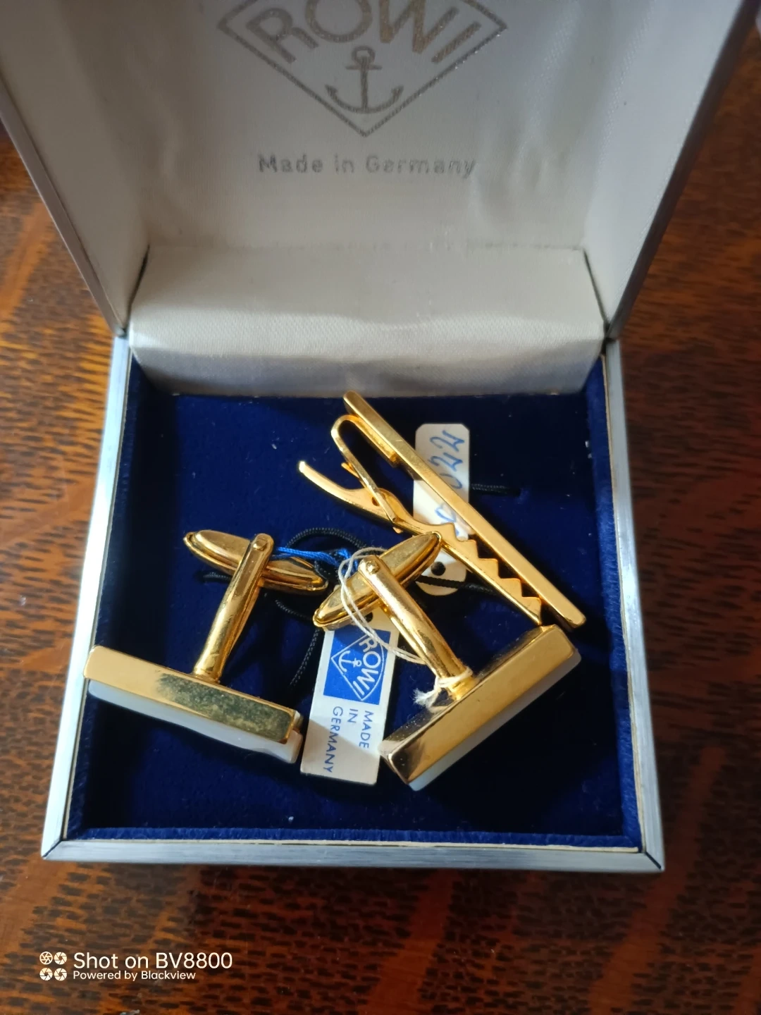 Selling a handsome set of ROWI cufflinks and a tie clip. This set is gold-toned and marked as "Made in Germany" on the box and tags. Comes in the original box!
