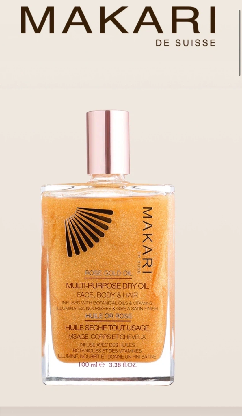 Selling a bottle of Makari De Suisse Rose Gold Oil! It's a multi-purpose dry oil designed for face, body, and hair. Infused with botanical oils and vitamins, it illuminates, nourishes, and gives a satin finish. The bottle contains 100 ml (3.38 fl.oz.)