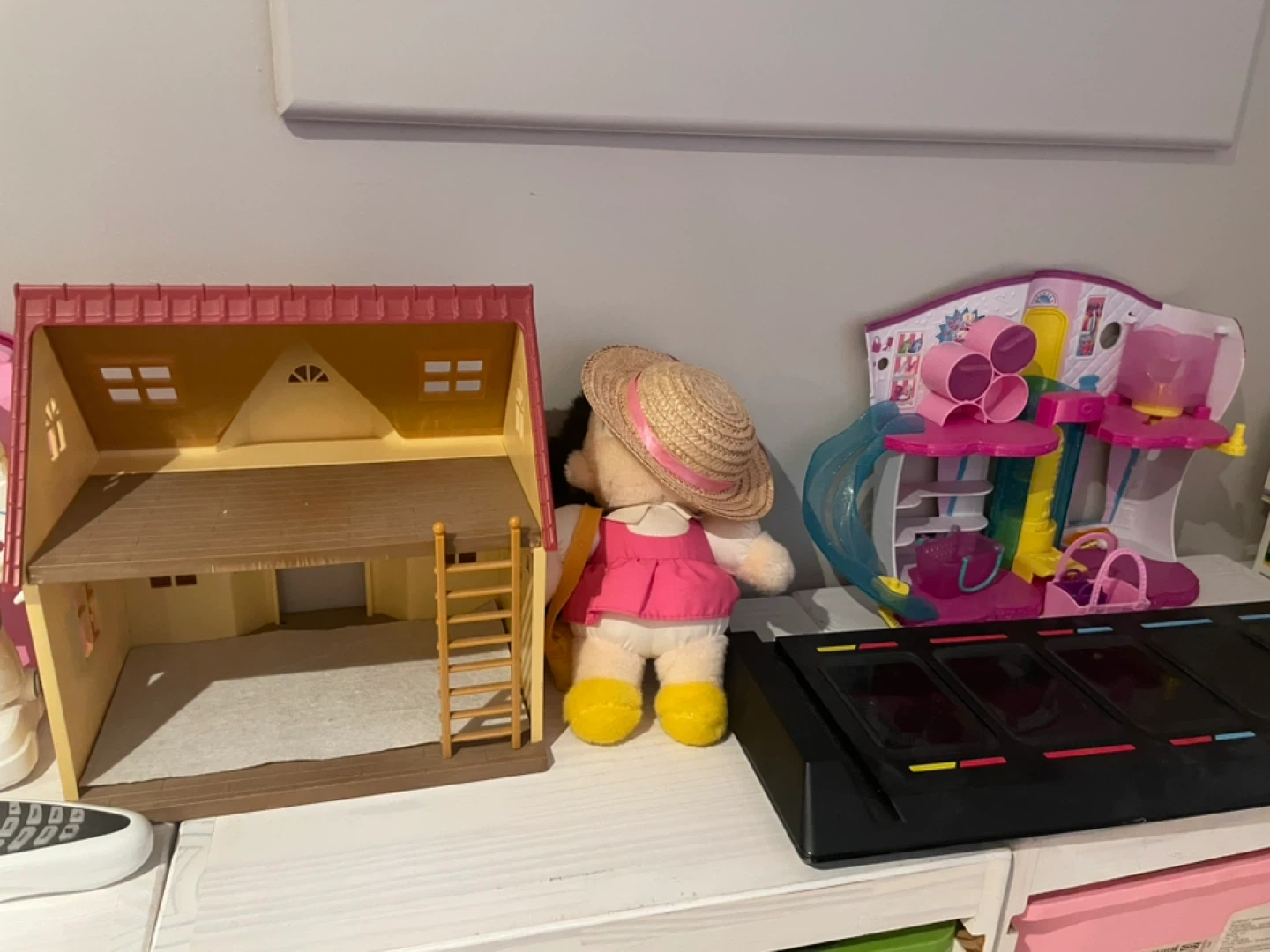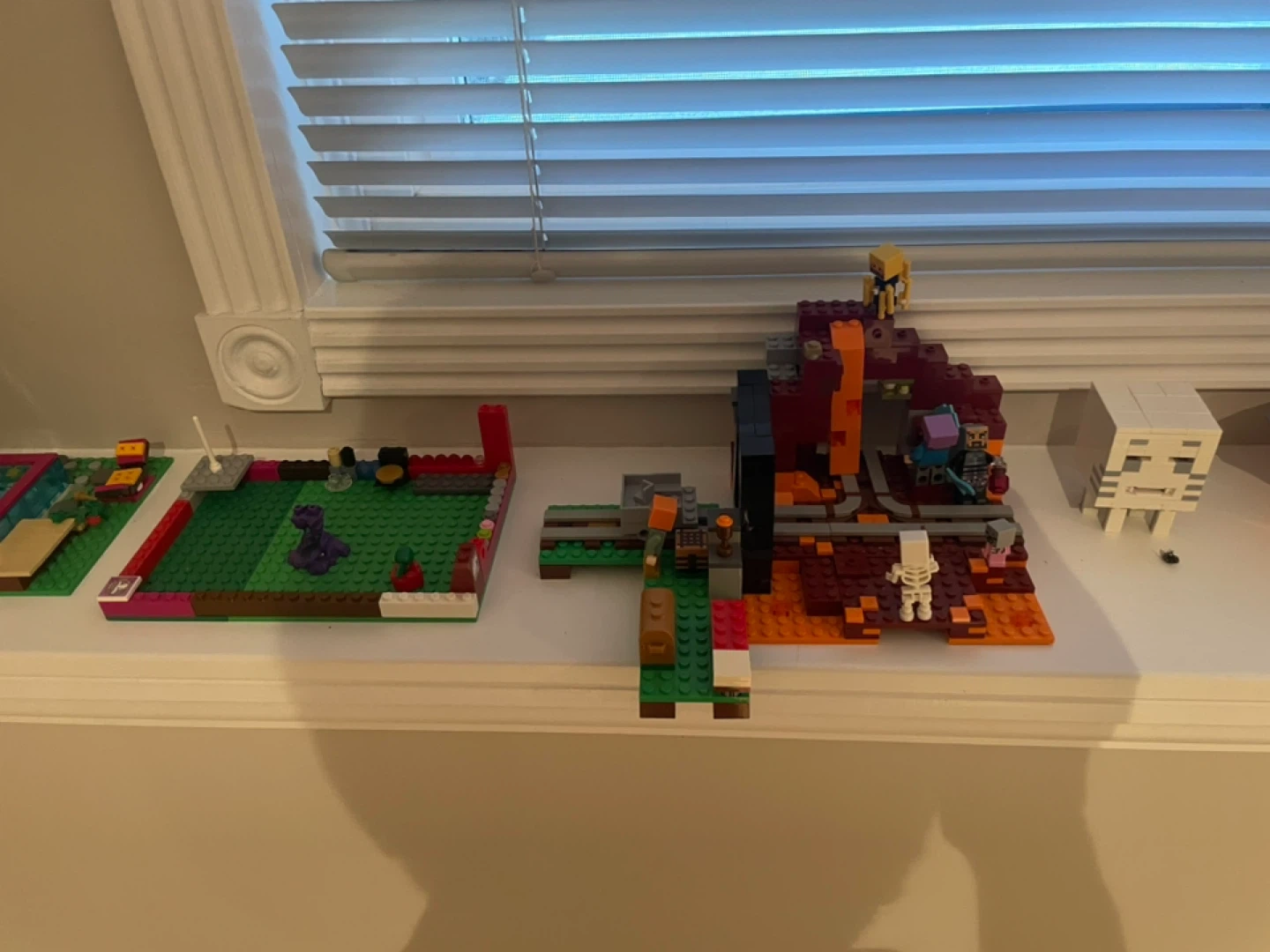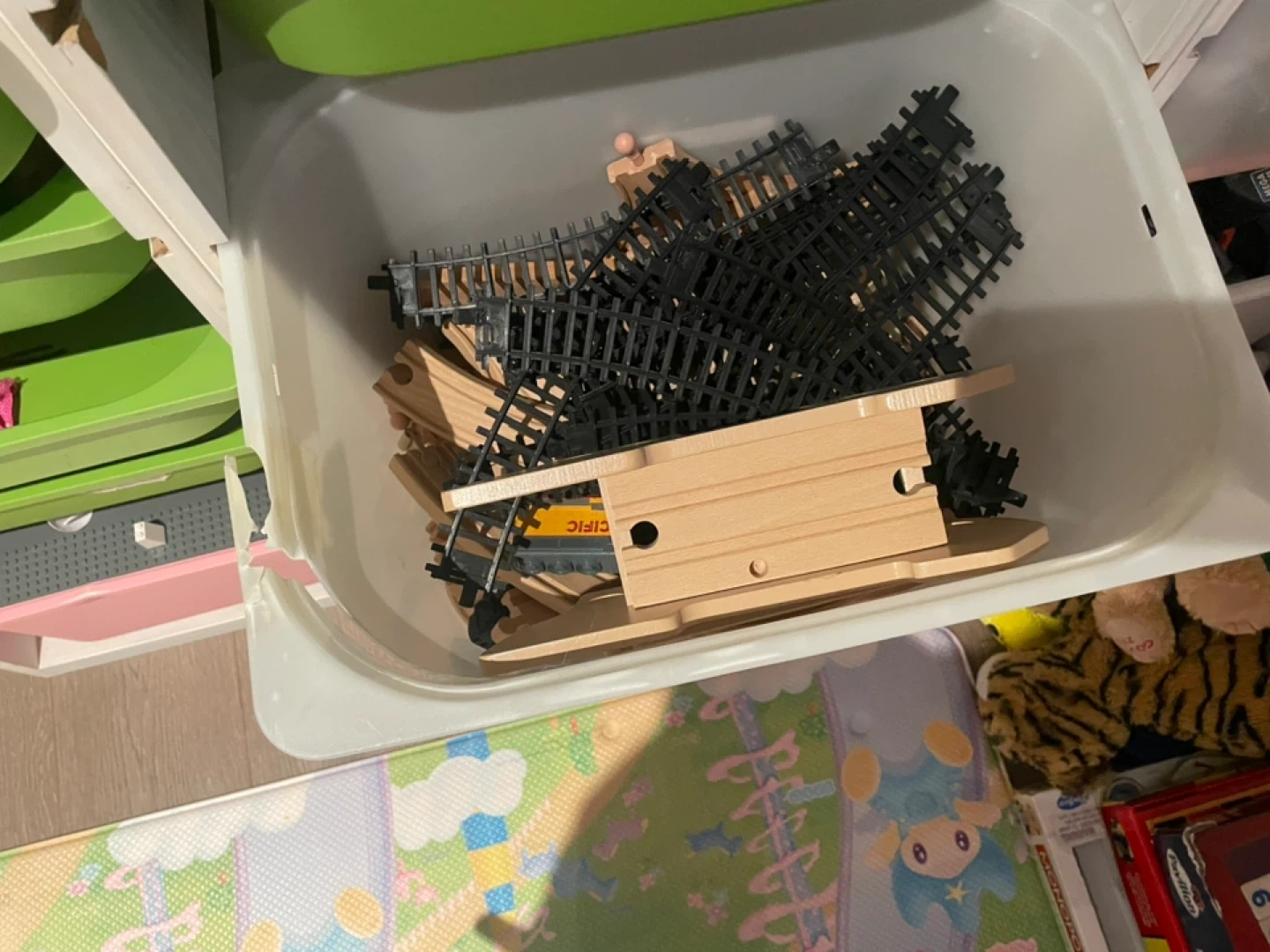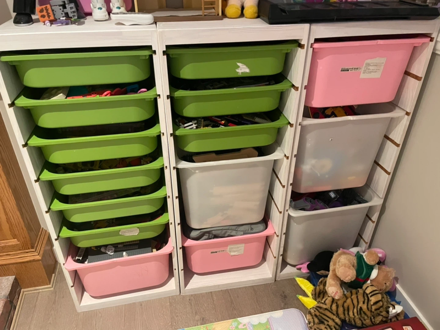 Selling a collection of mixed LEGO sets, INCLUDING the green/white/pink plastic bins and the white storage organizer itself as well.