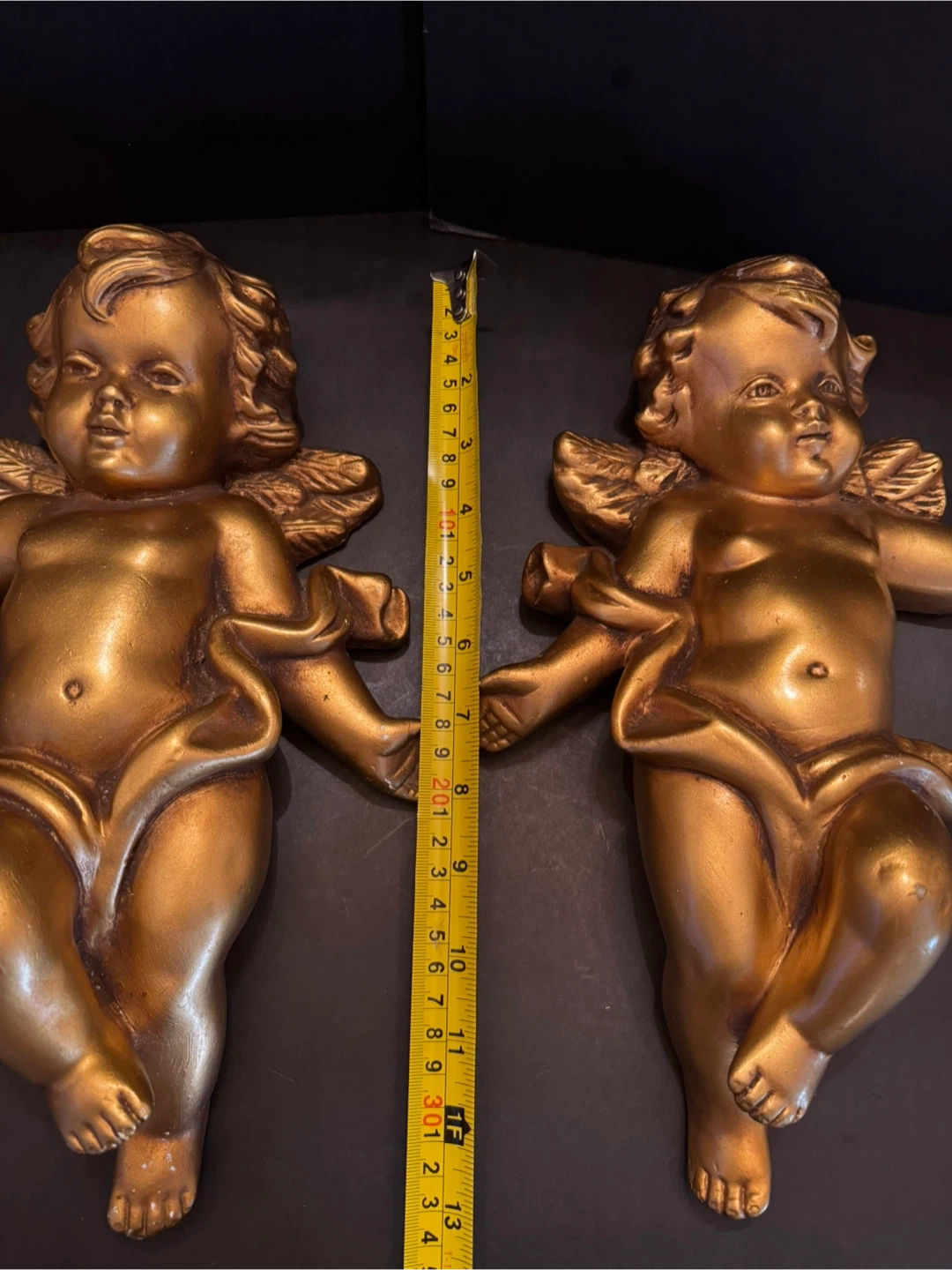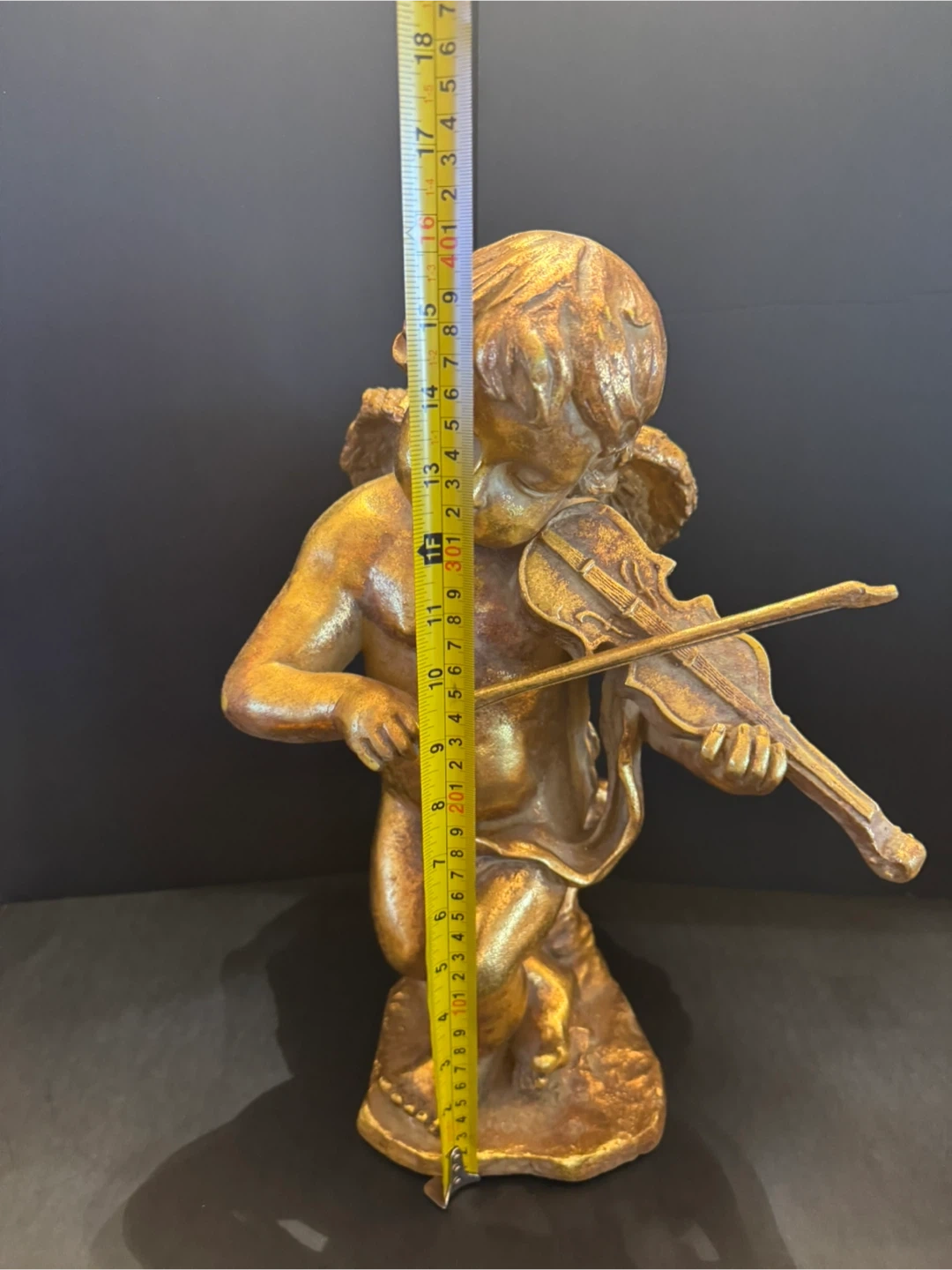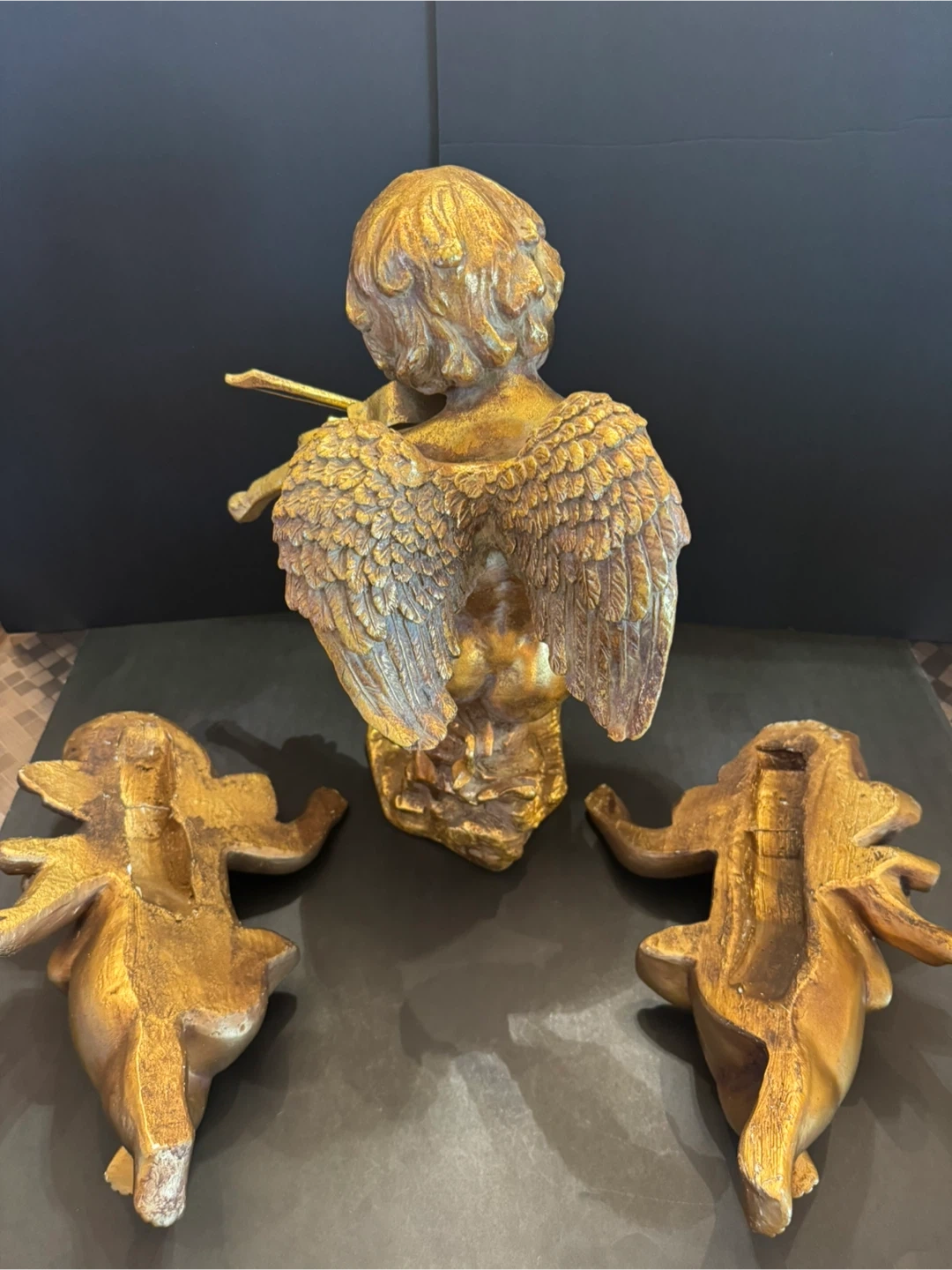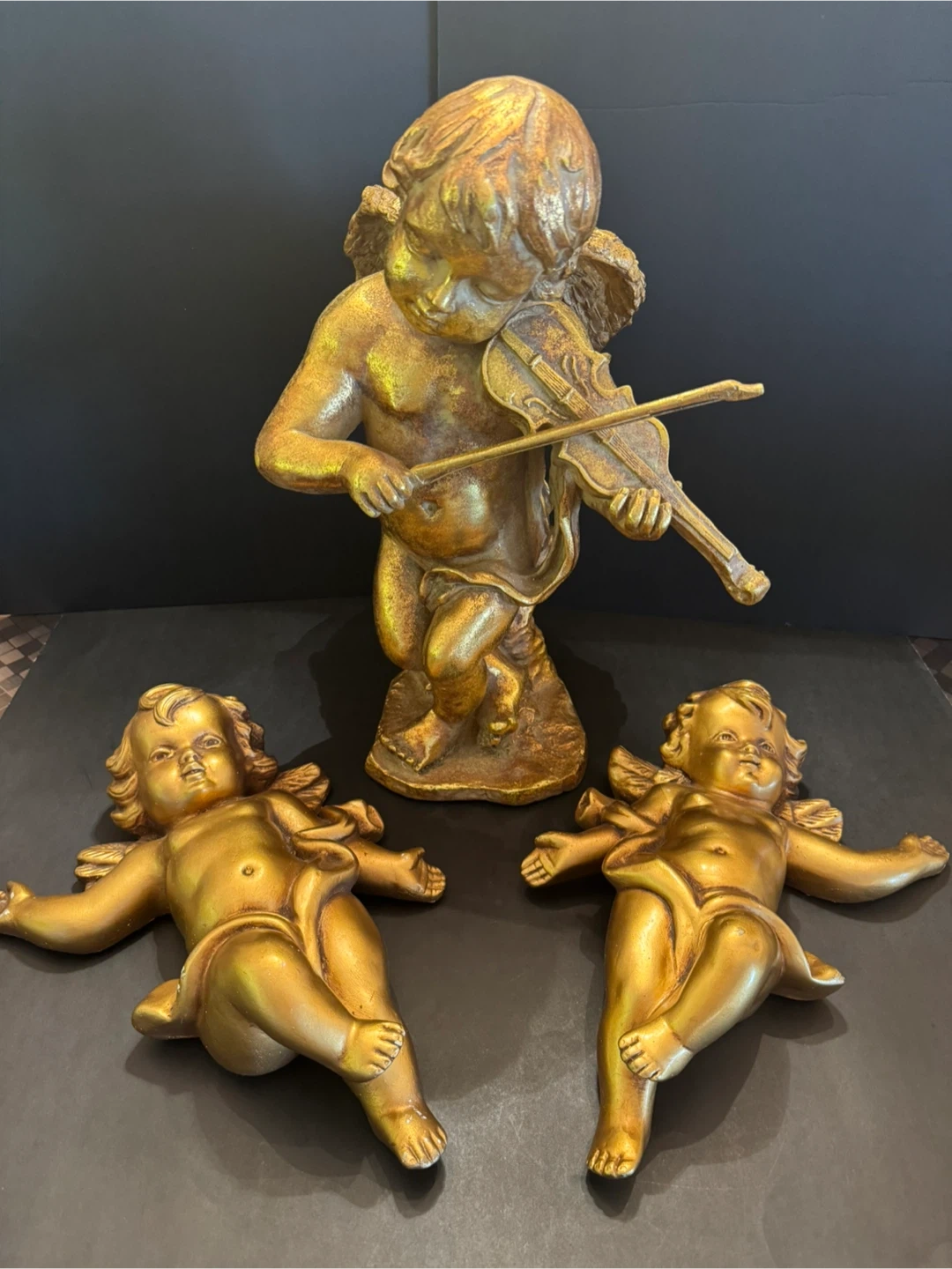 Add a touch of heavenly charm to your home with this set of three angel figurines, perfect for collectors or anyone who loves angelic decor. This set includes a larger angel playing the violin, standing approximately 16 inches tall, and two smaller cherub which you can hang on the wall, angels in a reclining pose, each about 13 inches long•