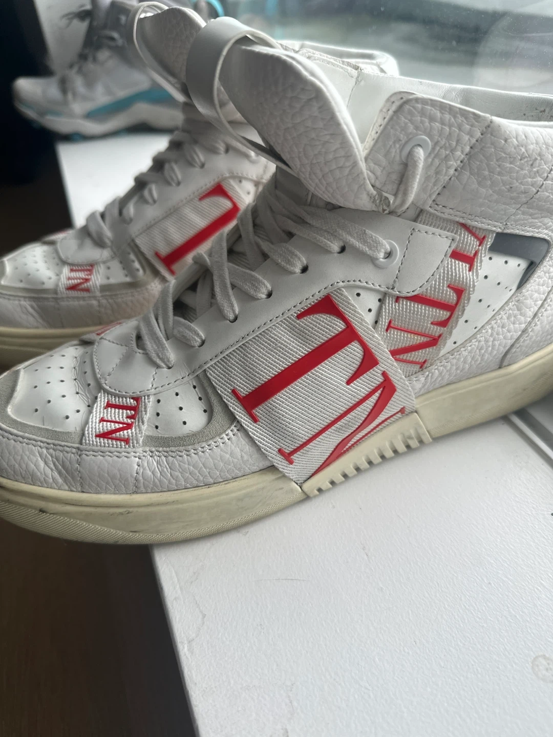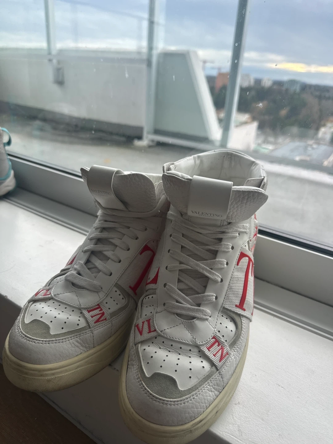 Selling a pair of Valentino high-top sneakers in white. They have a distinctive design with red accents. These shoes are stylish and comfortable, perfect for adding a touch of flair to your outfit!