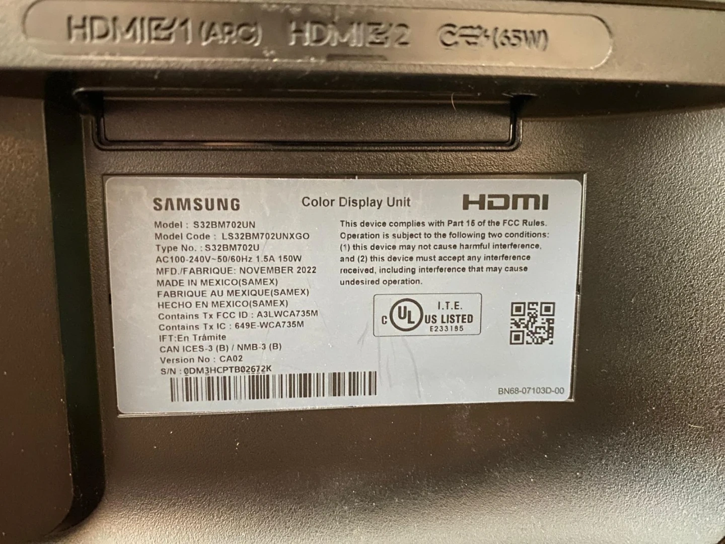 Selling a Samsung 32-inch smart monitor, model S32BM702UN. It's in great shape and ready for a new setup! Includes the remote control. The manufacturing date is November 2022.