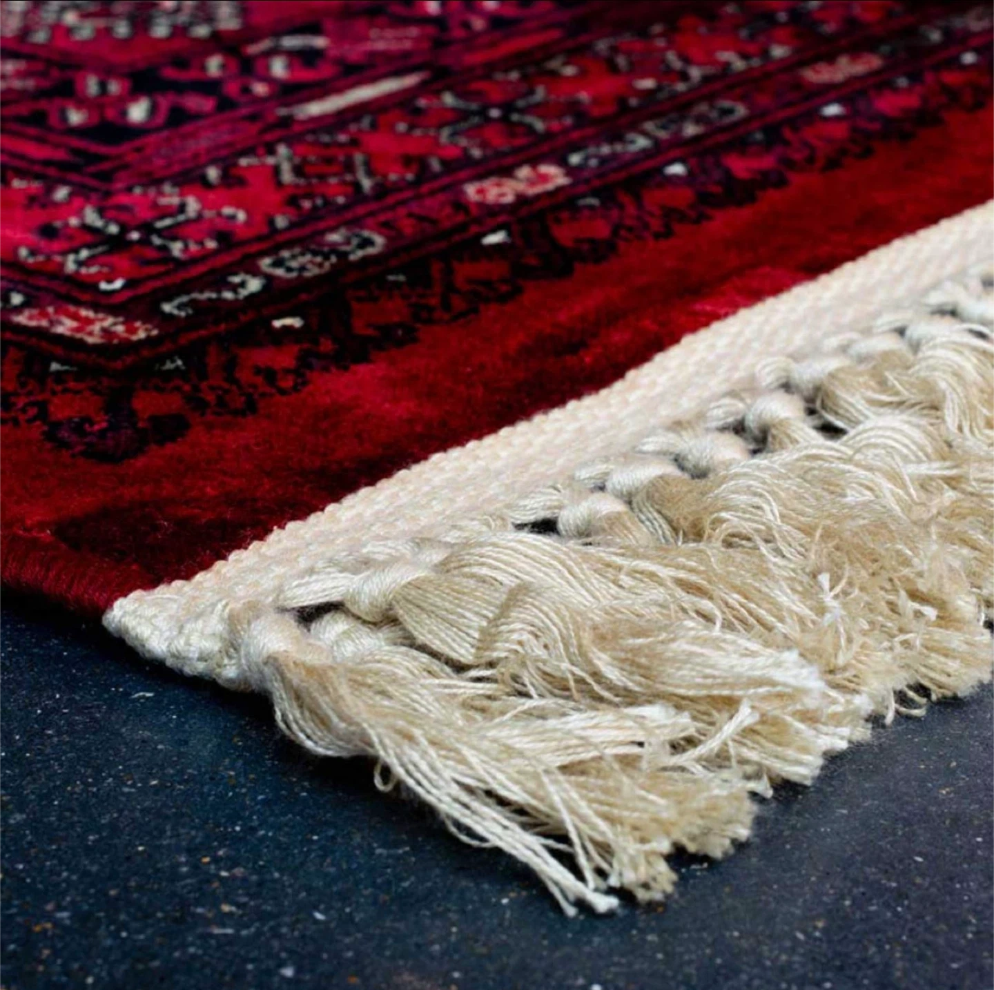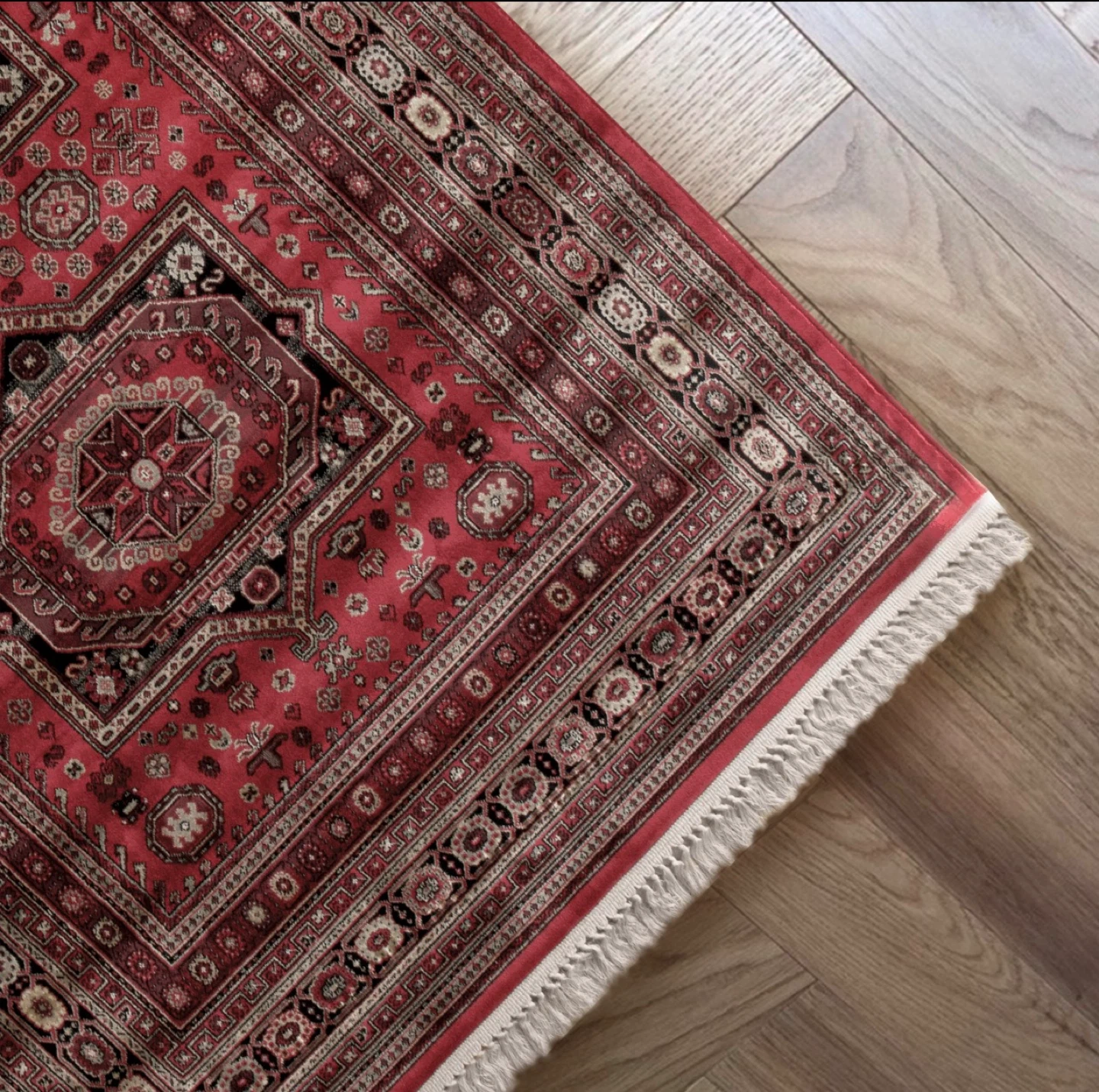 Beautiful Dynamic Rugs – Beluchi collection luxury area rug. Made in Belgium with 100% viscose, giving it a soft, elegant, silk-like sheen. Classic red and neutral tones with intricate patterning — perfect for a living room, dining room, or formal space.