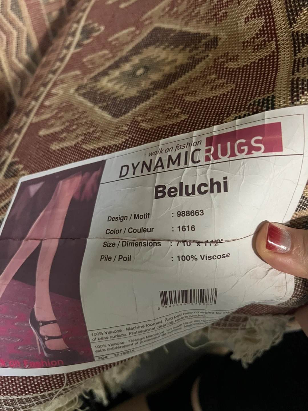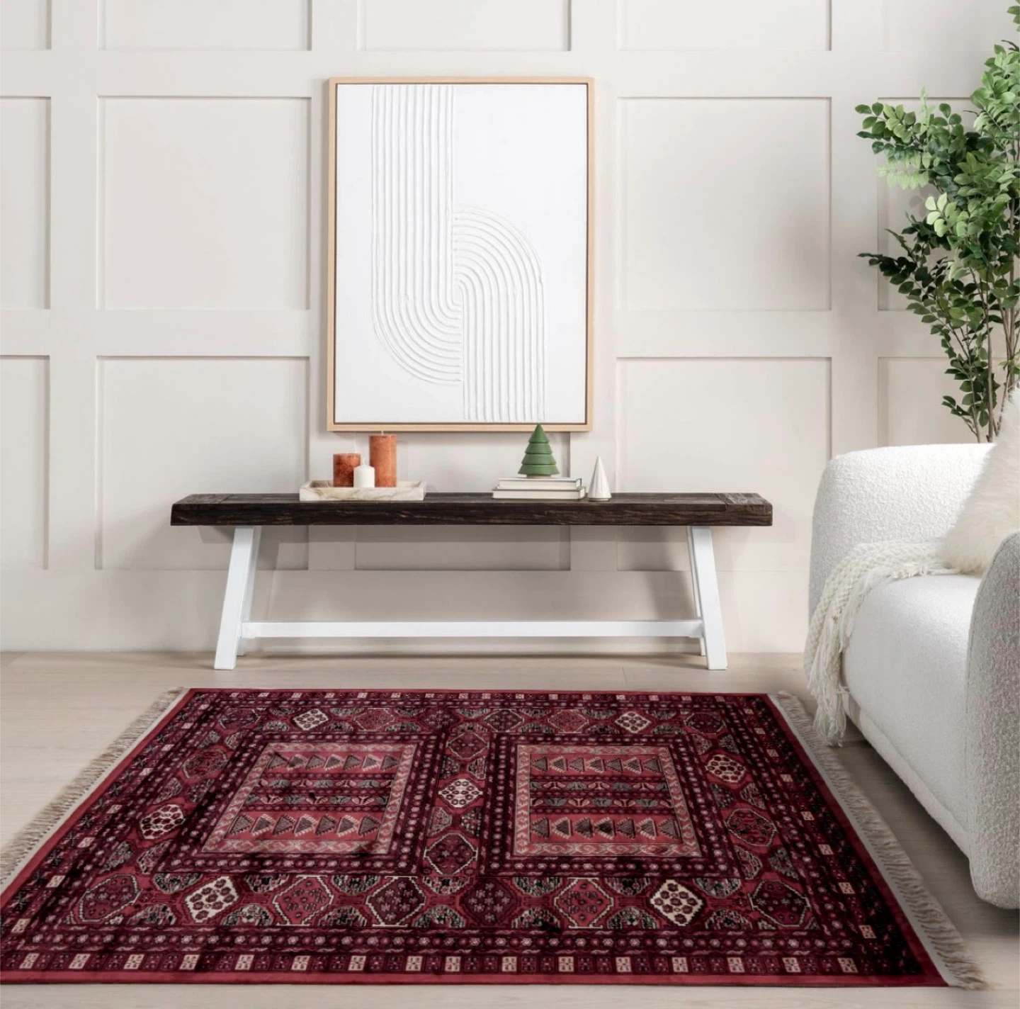 Beautiful Dynamic Rugs – Beluchi collection luxury area rug. Made in Belgium with 100% viscose, giving it a soft, elegant, silk-like sheen. Classic red and neutral tones with intricate patterning — perfect for a living room, dining room, or formal space.