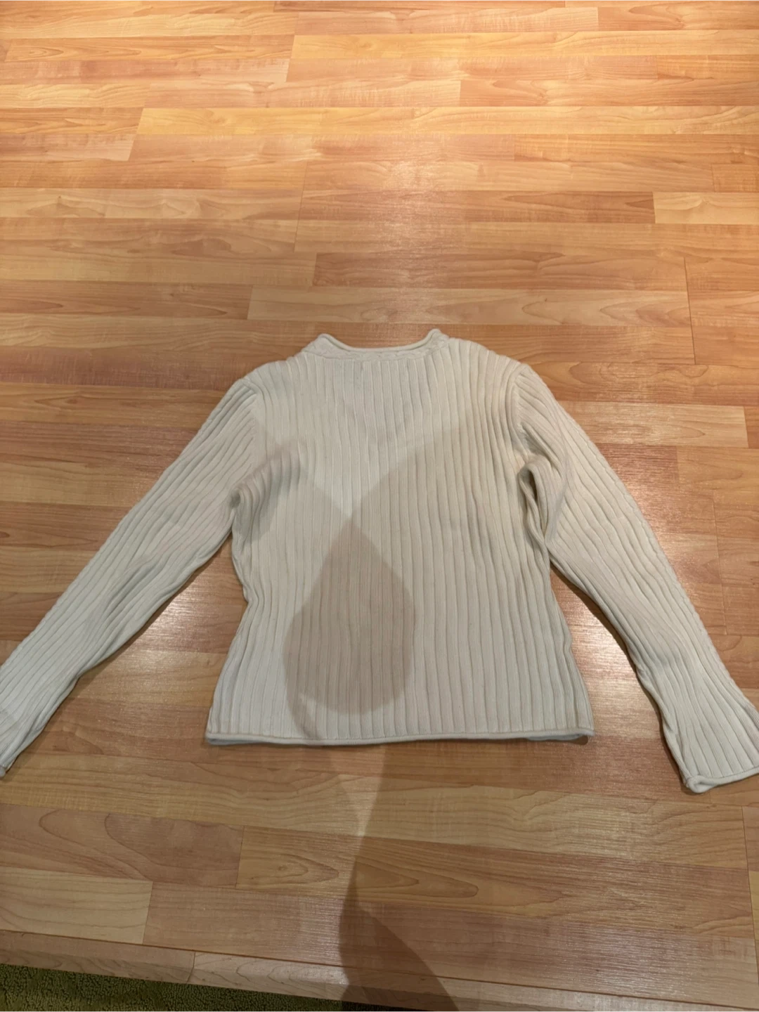 Here's a Tommy Hilfiger sweater in a lovely white ribbed knit! It features a V-neck and stylish stripes along the sleeves. Perfect for adding a touch of classic style to your wardrobe