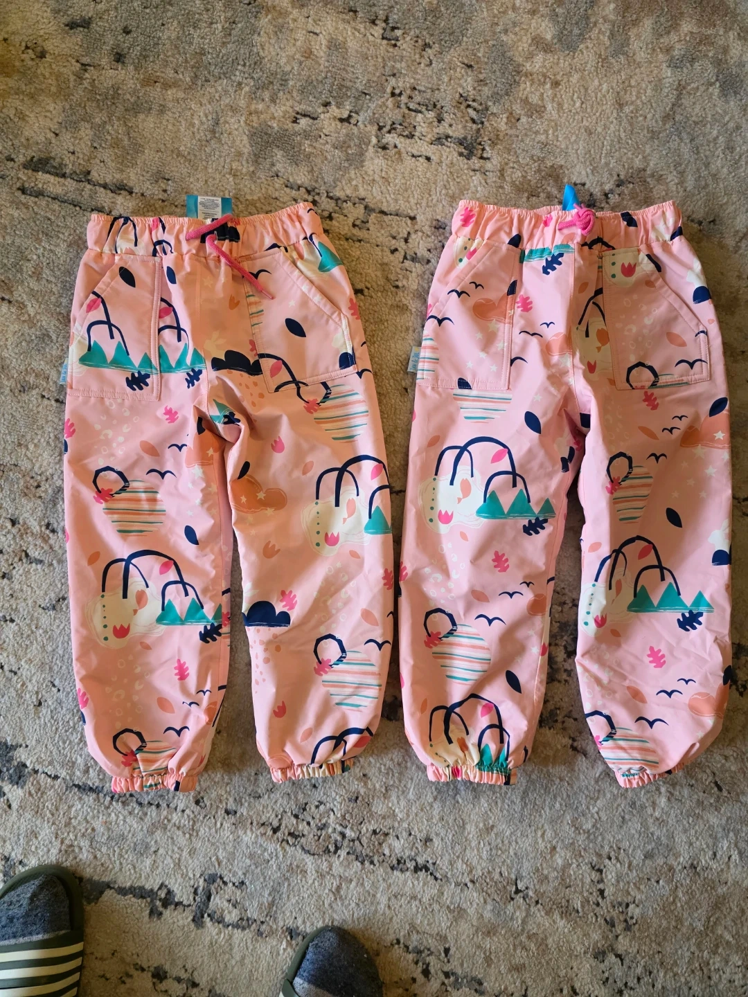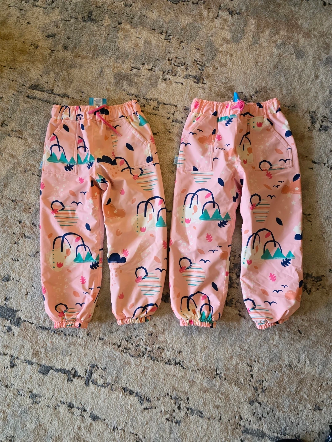 Selling a pair of Jan & Jul Play On pants in size 4T. They're in great condition and ready for your little one's next adventure! They have a cute pink pattern with mountains and clouds