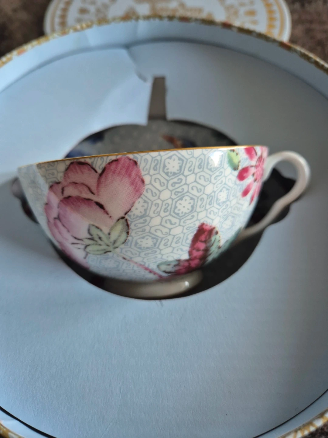 Selling beautiful Wedgwood Cuckoo teacup and saucer in pink and blue! It's made of bone china and comes with its original box. A lovely addition to any tea set or a perfect gift for a tea lover.