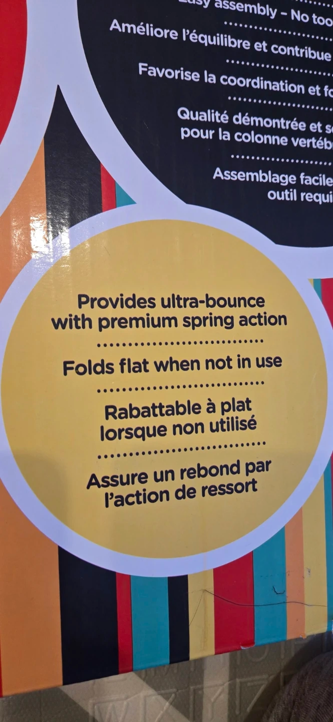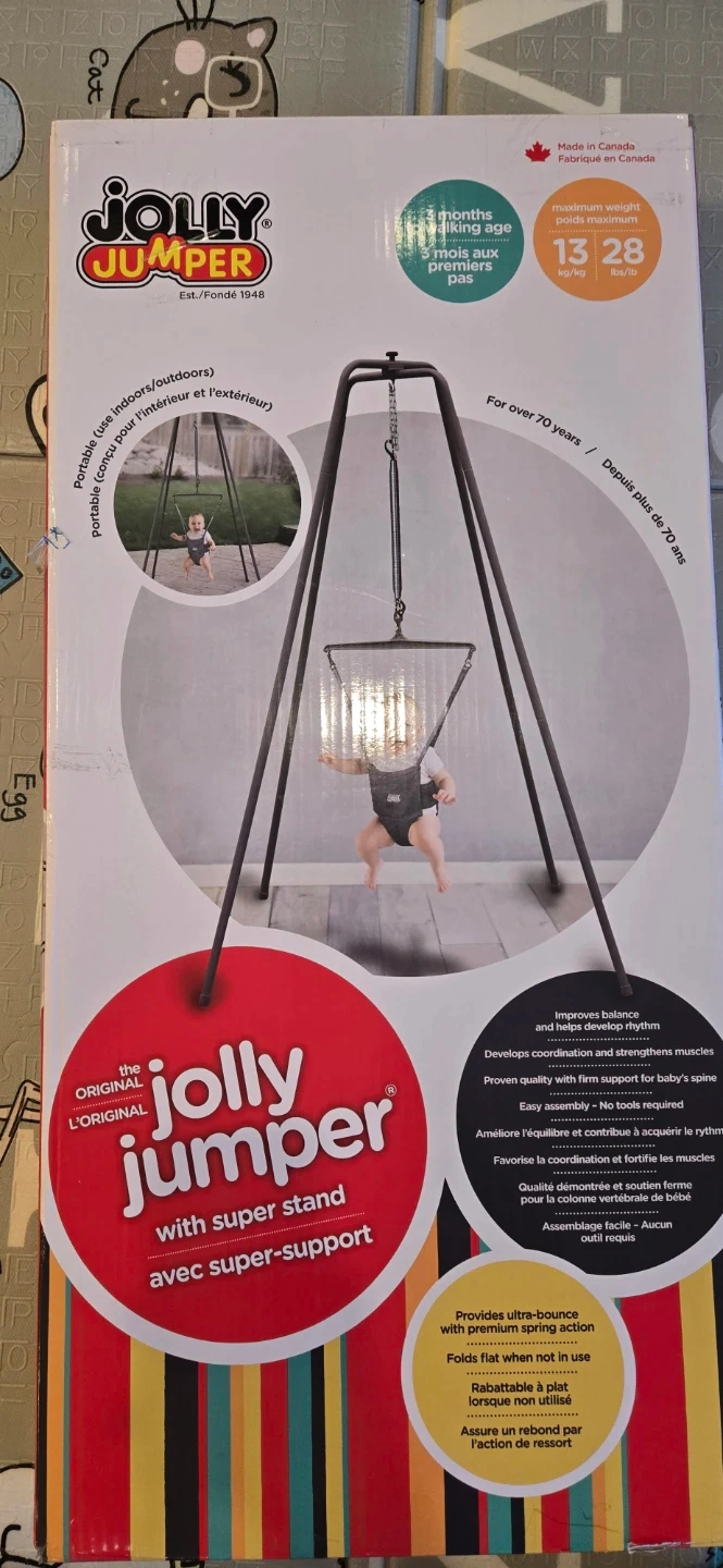 Jolly Jumper with Super Stand for babies 3 months and up! It's in great condition and provides ultra-bounce with premium spring action. It's easy to assemble with no tools required and folds flat when not in use. It improves balance and helps develop rhythm, while also developing coordination and strengthens muscles. Weight capacity is 13 kg / 28 lbs