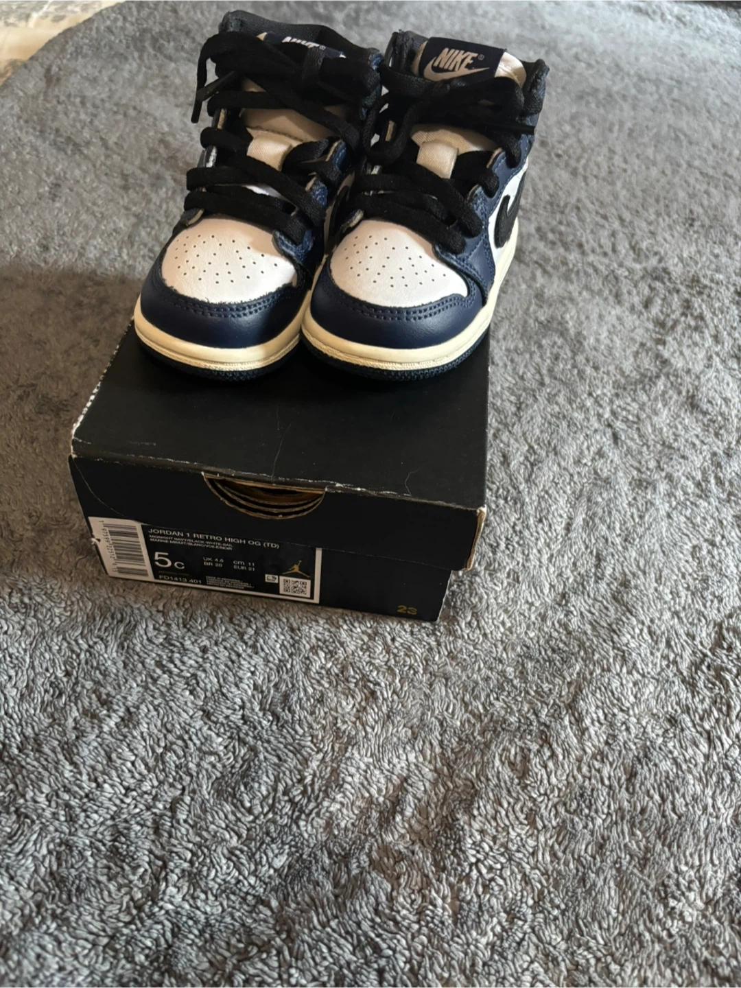I'm selling a pair of Nike Jordan 1 Retro High OG (TD) in size 5C. They are in great condition barely worn and come with the original box. Perfect for your little one!