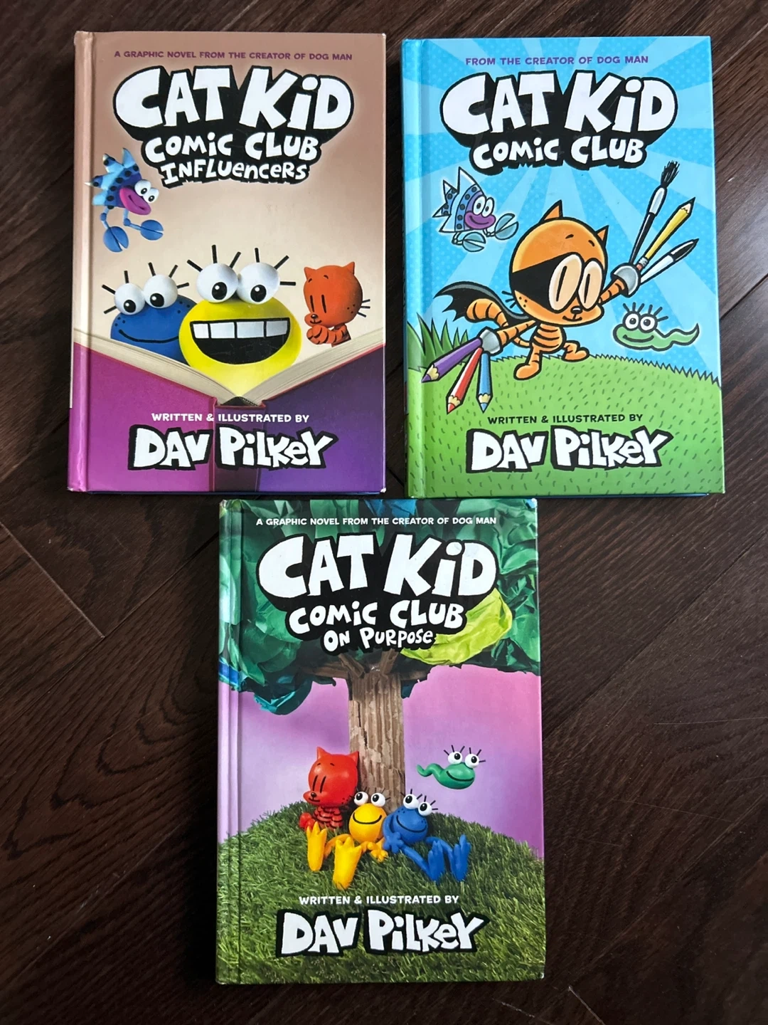 Selling three Cat Kid Comic Club books written and illustrated by Dav Pilkey! Titles include Influencers, Comic Club, and On Purpose. Great for young readers who enjoy graphic novels!