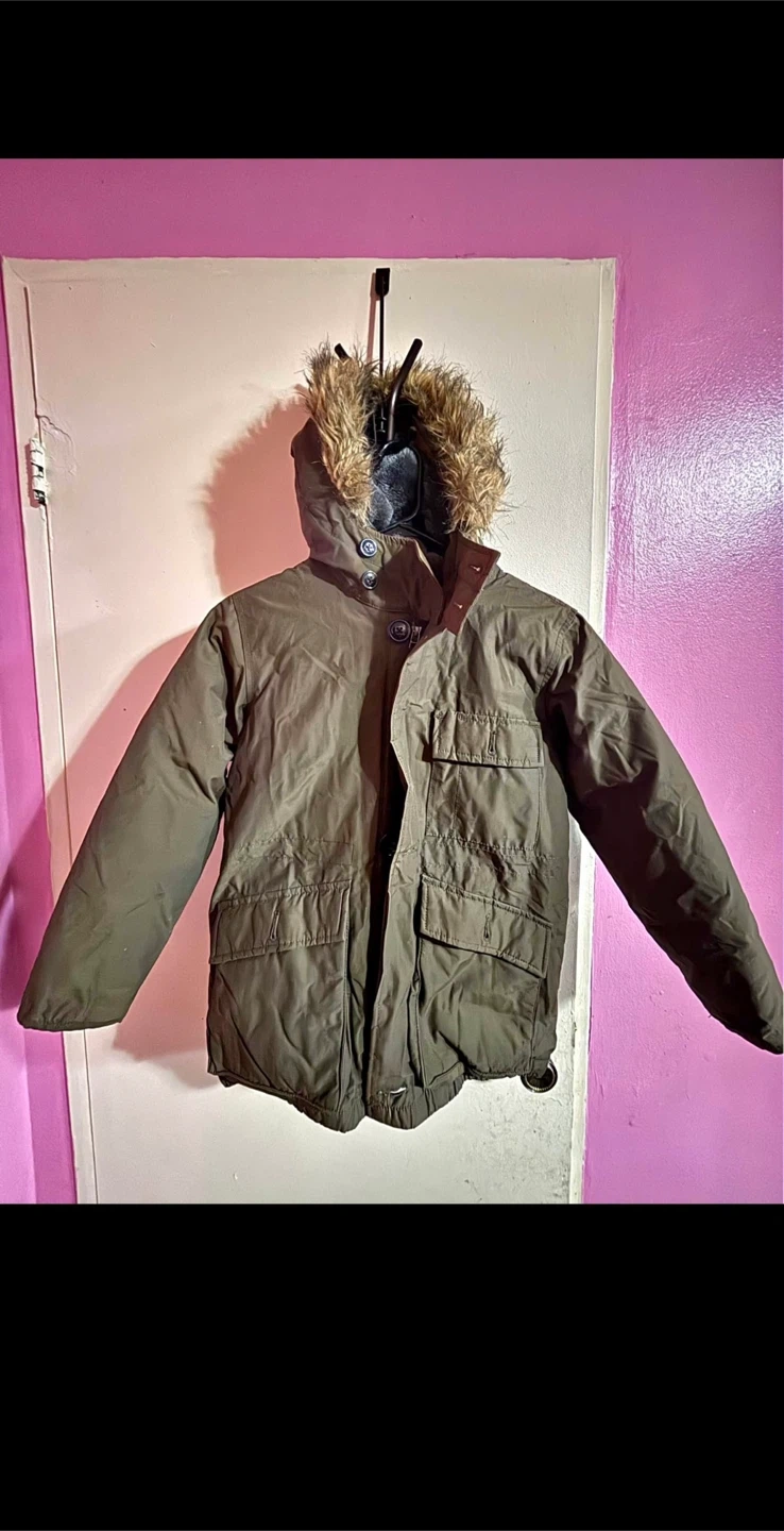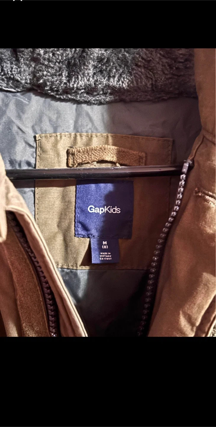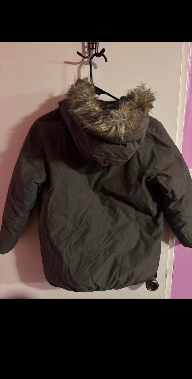 Here's a Gap Kids winter parka in olive green! It's a size M (8) and has a faux fur trim on the hood, perfect for keeping your little one warm this winter
