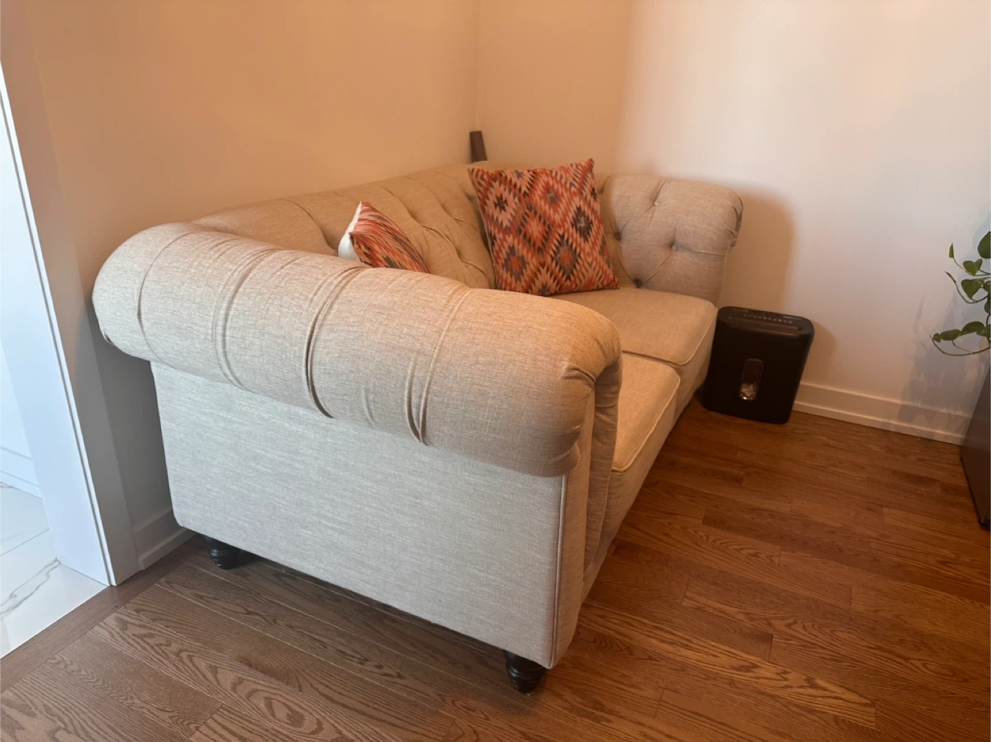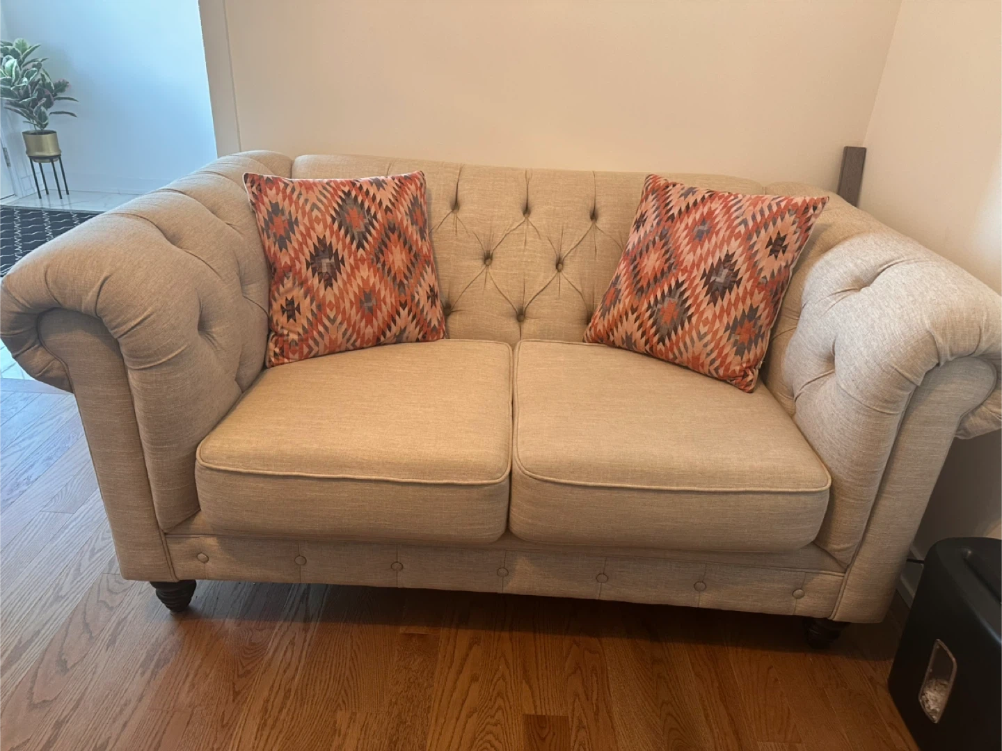 Selling a lovely beige Chesterfield loveseat sofa! It's in great condition and would be a beautiful addition to any living space. The tufted design and rolled arms give it a classic, elegant look. Perfect for a small apartment or cozy nook!