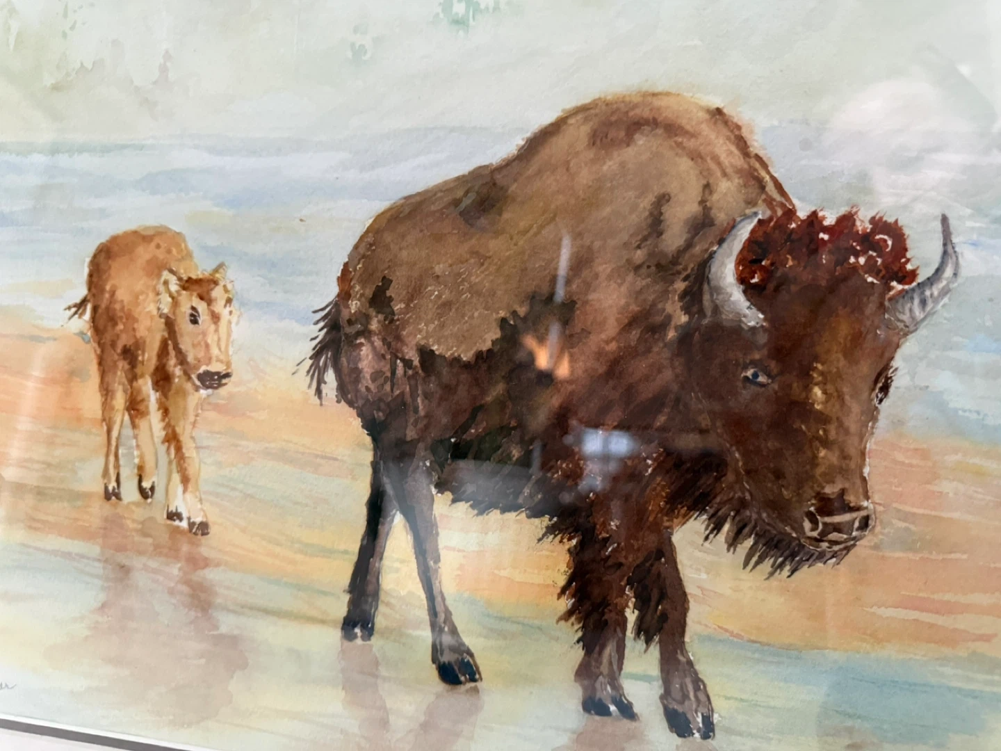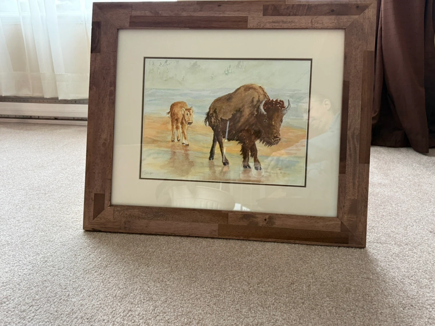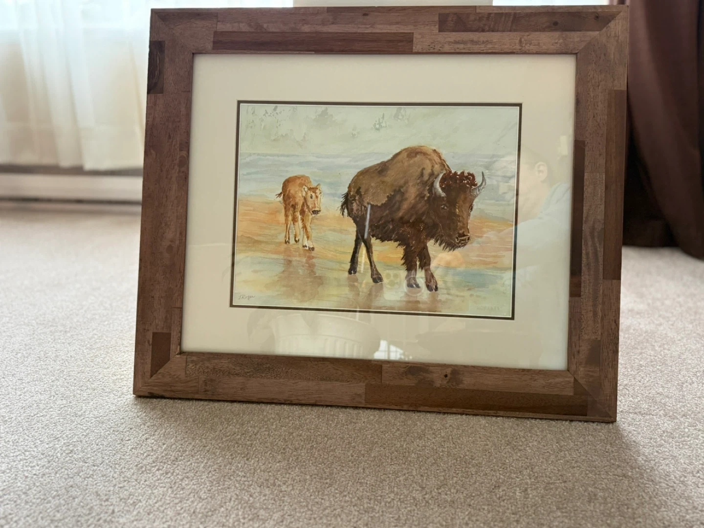 Beautiful framed watercolor artwork depicting a mother bison and her calf. The painting has a rustic wooden frame, adding to its charm. It's ready to bring a touch of nature to your home!