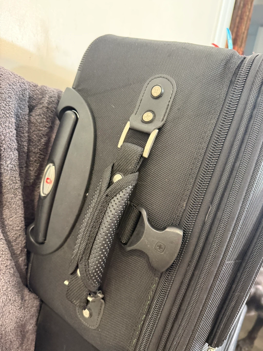 Black SwissGear 4010 softside luggage set with spinner wheels. Includes multiple zippered compartments for organization. Durable polyester construction.