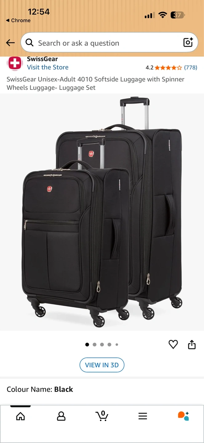 Black SwissGear 4010 softside luggage set with spinner wheels. Includes multiple zippered compartments for organization. Durable polyester construction.