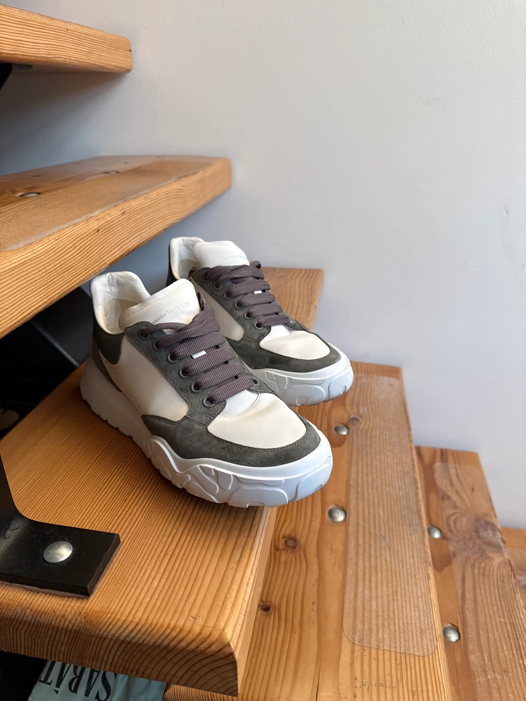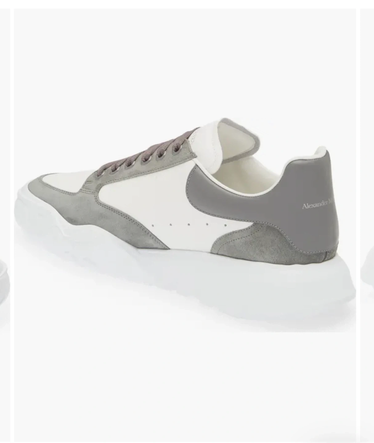 Selling a pair of Alexander McQueen Court Trainer Sneakers for men. These stylish sneakers feature a sleek design with a mix of white and grey tones. Perfect for adding a touch of luxury to your casual outfits!