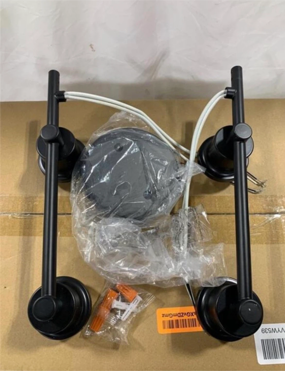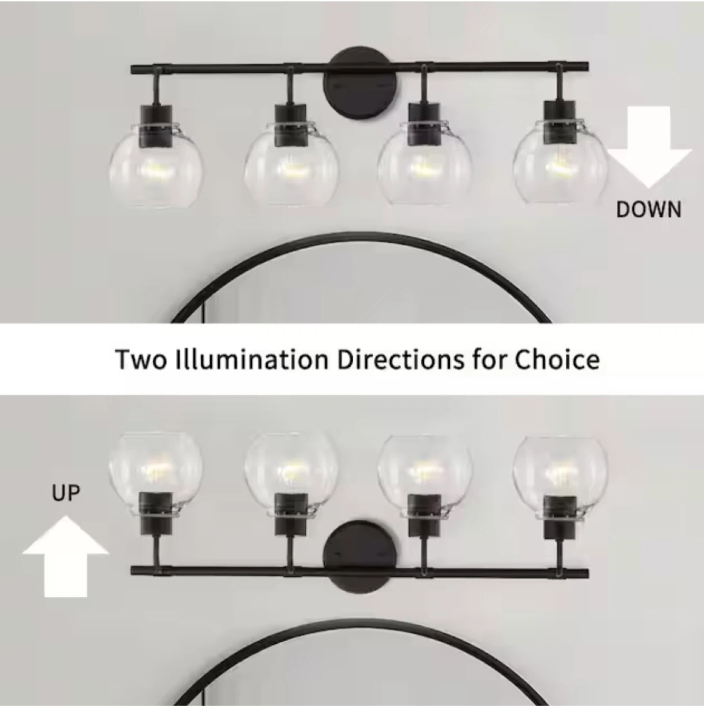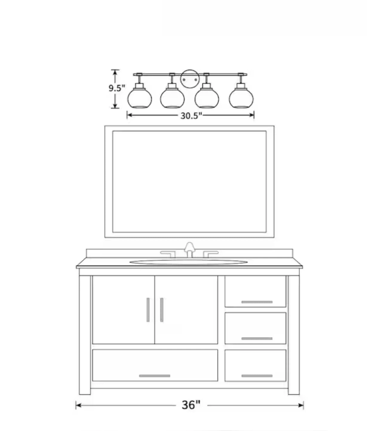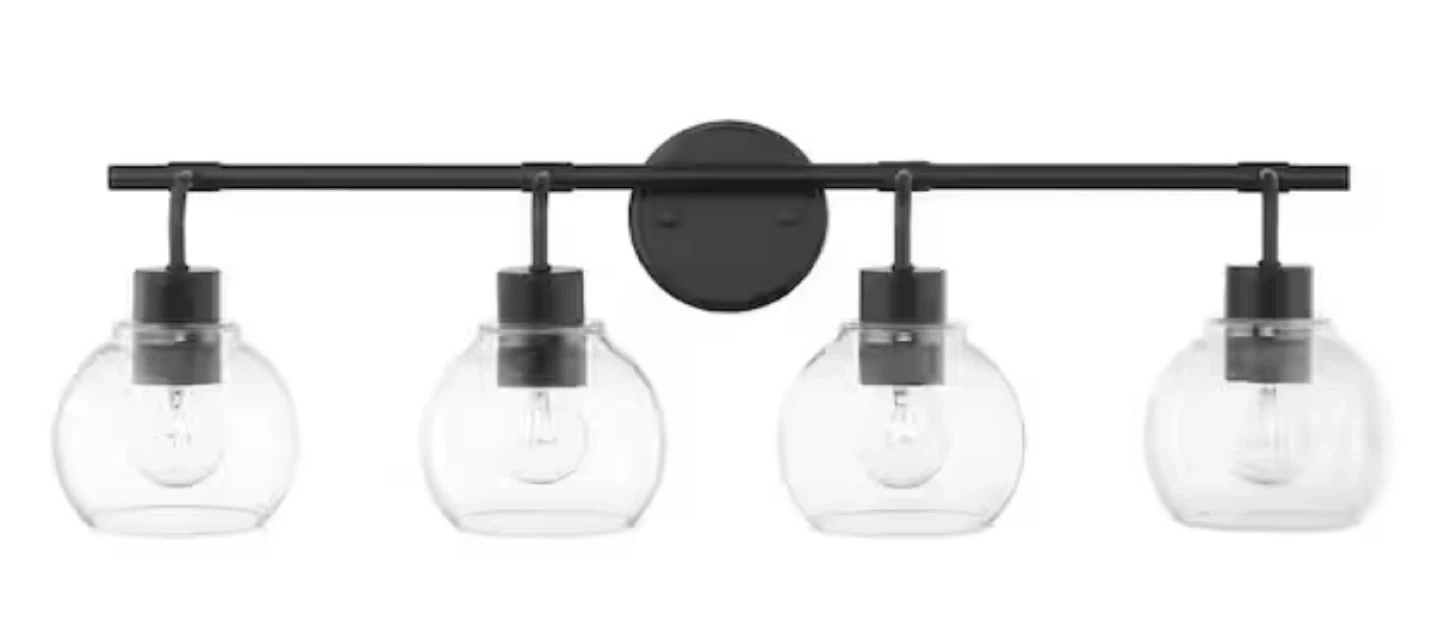 Selling a 4-light bathroom vanity light fixture in black! The dimensions are approximately 30.5 inches wide and 9.5 inches high. It's a stylish addition to any bathroom setup. Bulbs are not included.