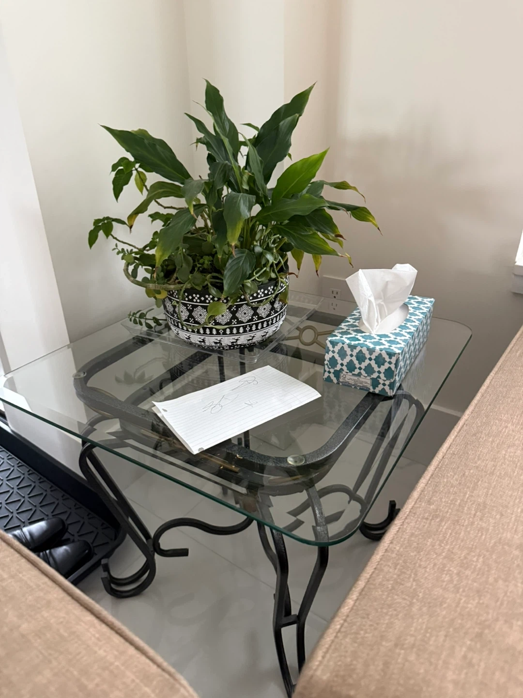 Selling a glass top coffee table with a wrought iron base. It's in great condition and would look lovely in any living room. The glass is clear and the base has a nice, decorative design. TWO PIECE!