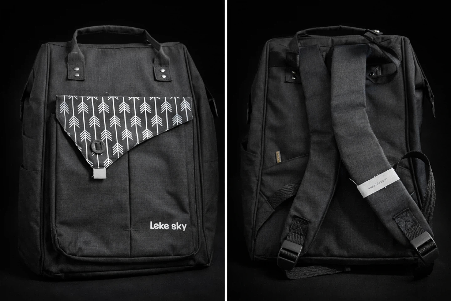 This is a Leke Sky diaper bag backpack in grey. It features a stylish arrow pattern on the front pocket. It looks to be in great condition and ready for a new family!