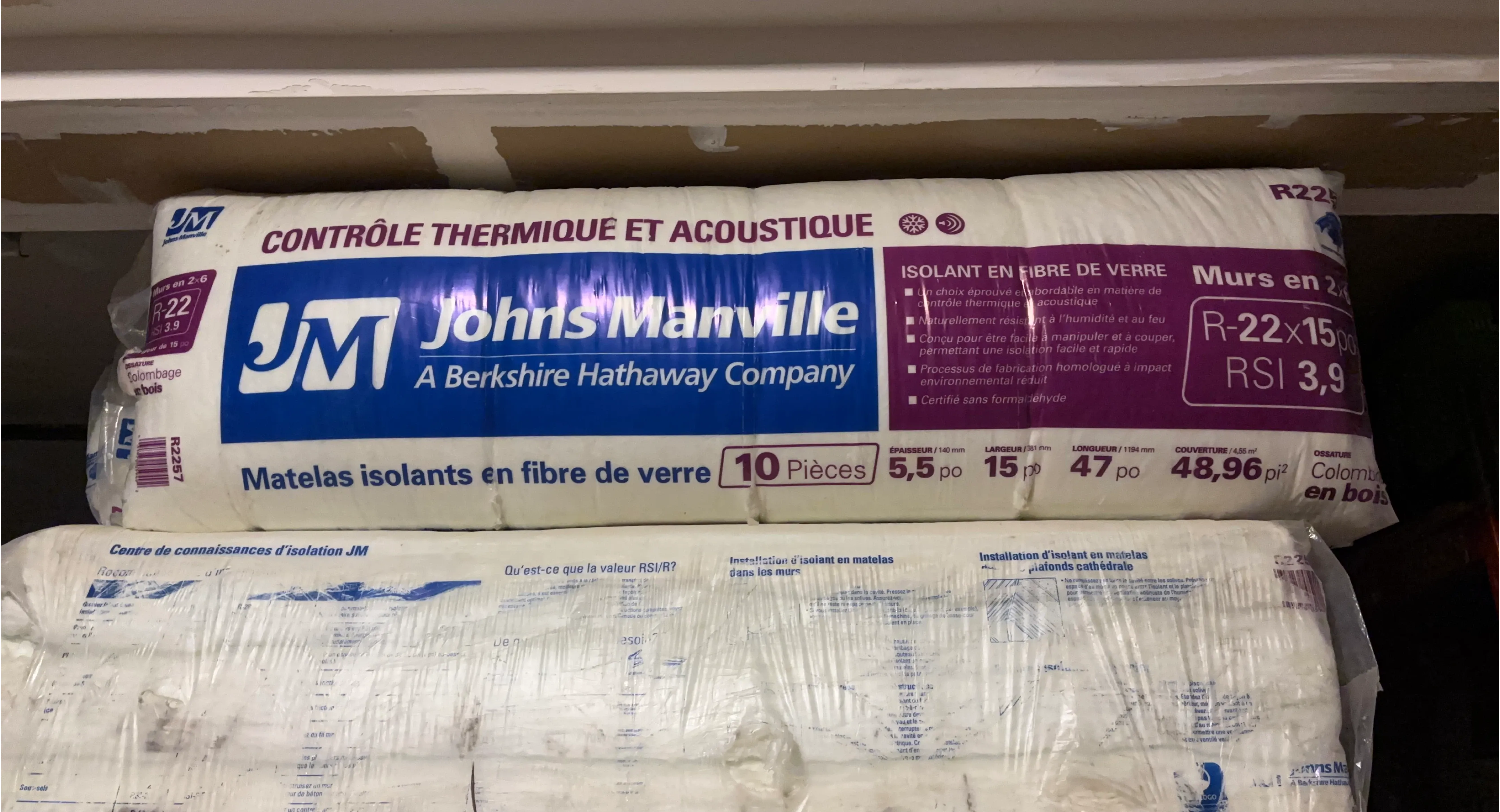 Selling a package of Johns Manville R-22 insulation. This package contains 10 pieces of fiberglass insulation. Each piece measures 5.5 inches thick, 15 inches wide and 47 inches long. Perfect for insulating walls in 2x6 construction