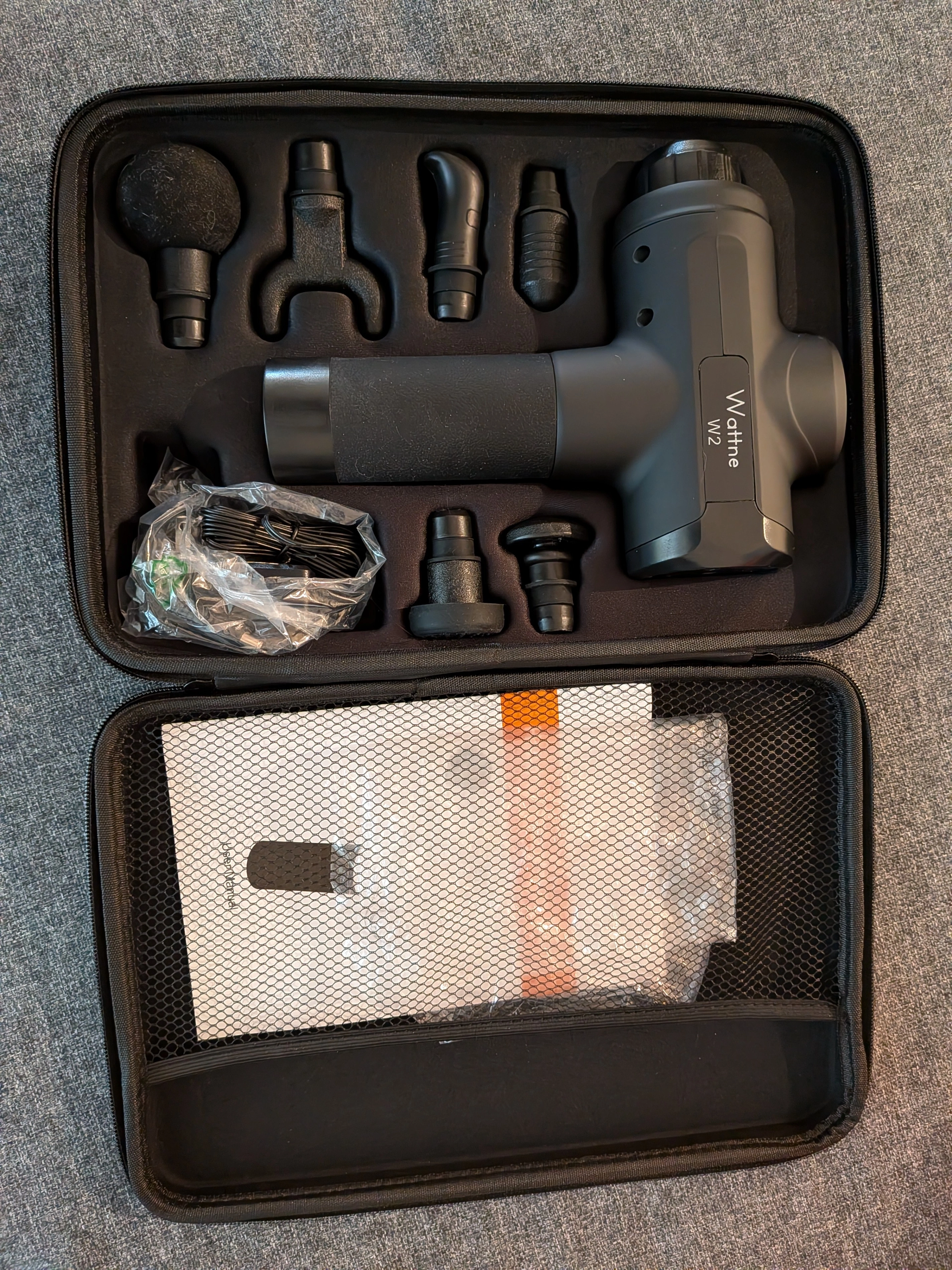 Selling a Wattne W2 massage gun in great condition! It comes with all the attachments shown in the pictures, as well as the charger and carrying case.