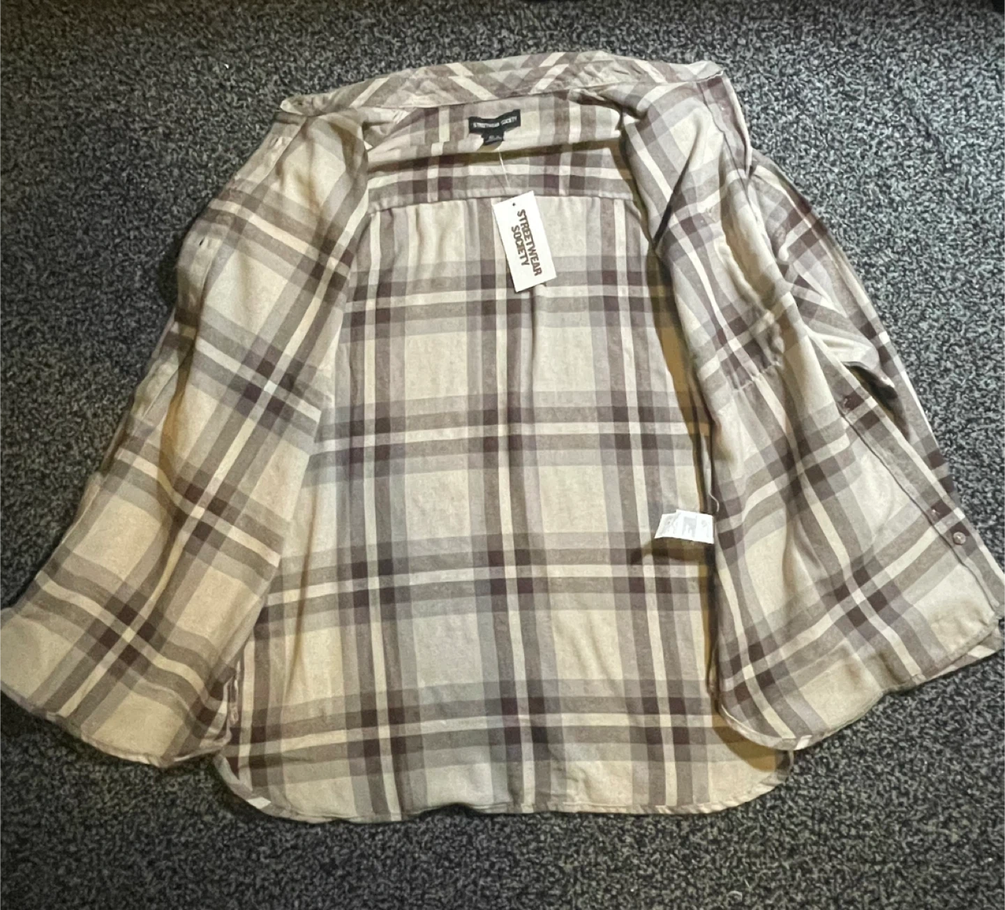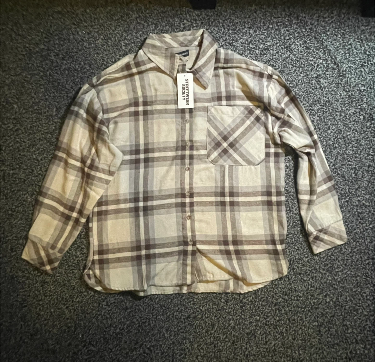 Here's a Streetwear Society flannel shirt in a classic plaid pattern! It's a size women’s medium and in great condition. Perfect for layering or wearing on its own. It’s is brand new with the tag still on!