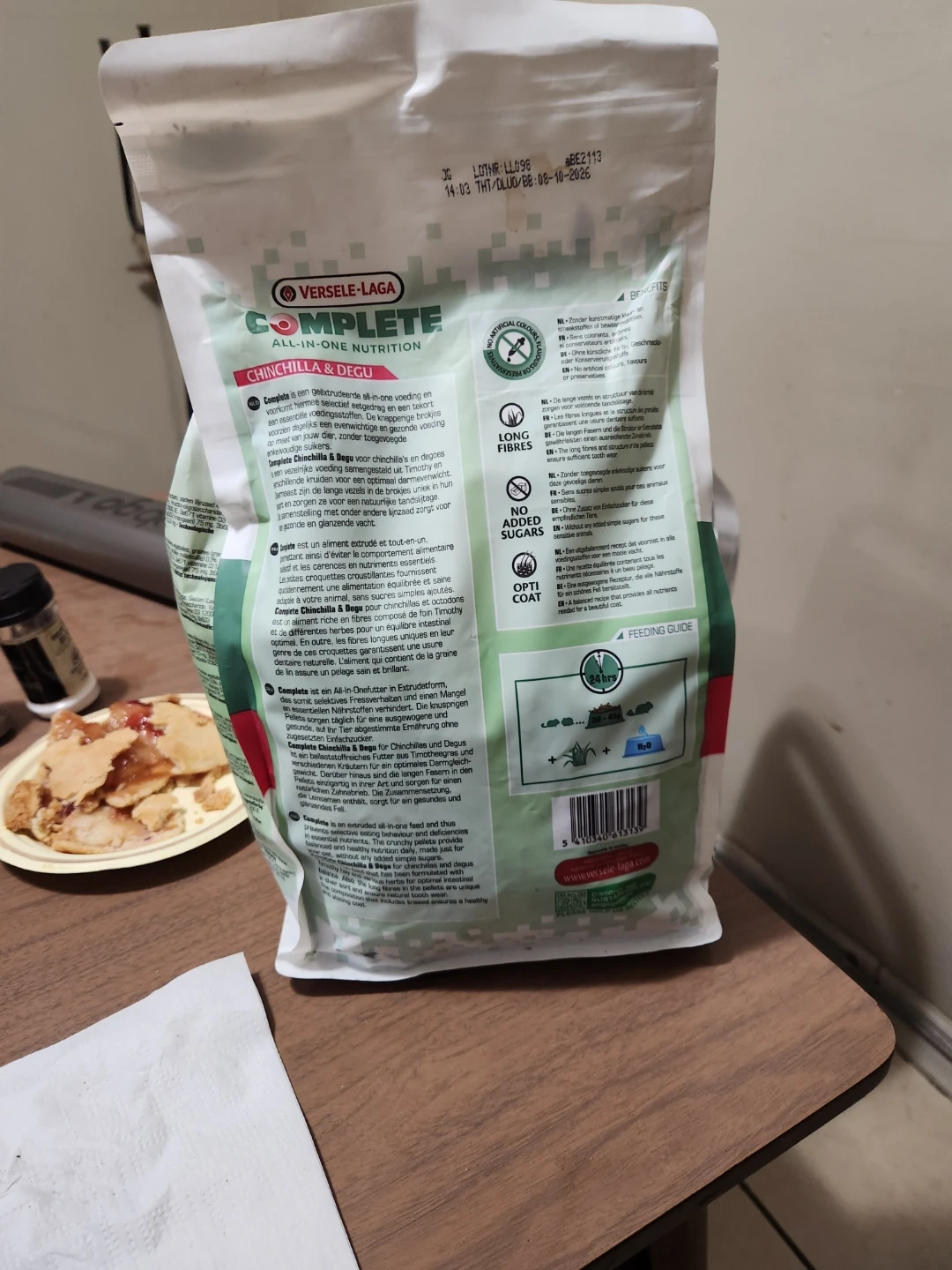Selling a bag of Versele-Laga Complete All-in-One Nutrition food for chinchillas and degus. It's a complete food with long fibres and no added sugars. Perfect for your little furry friends!