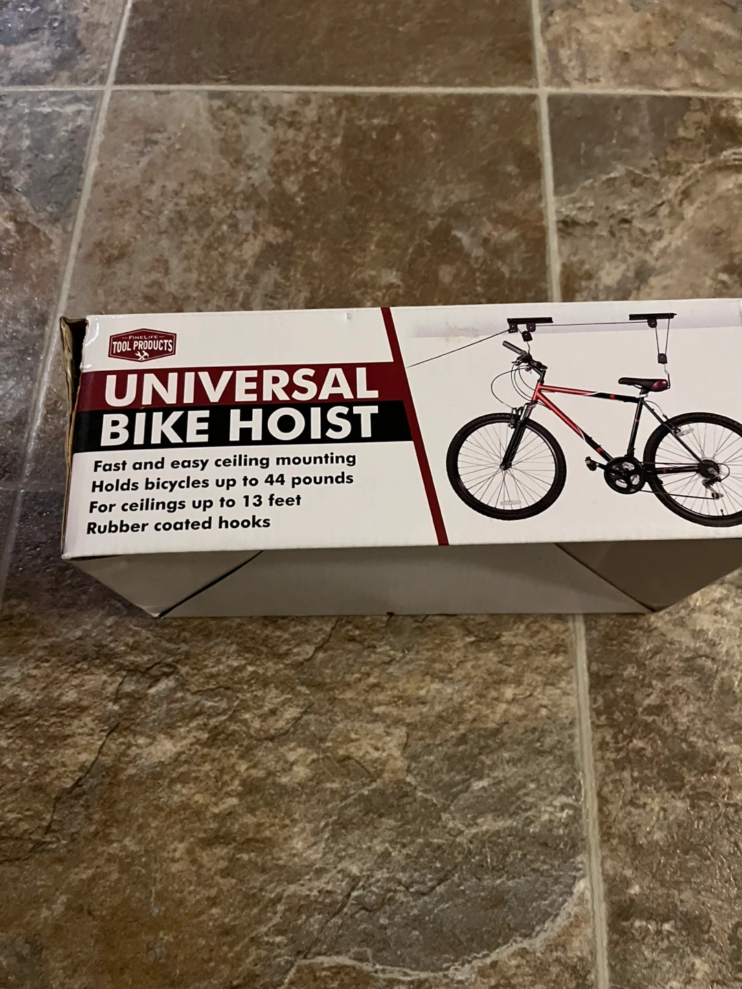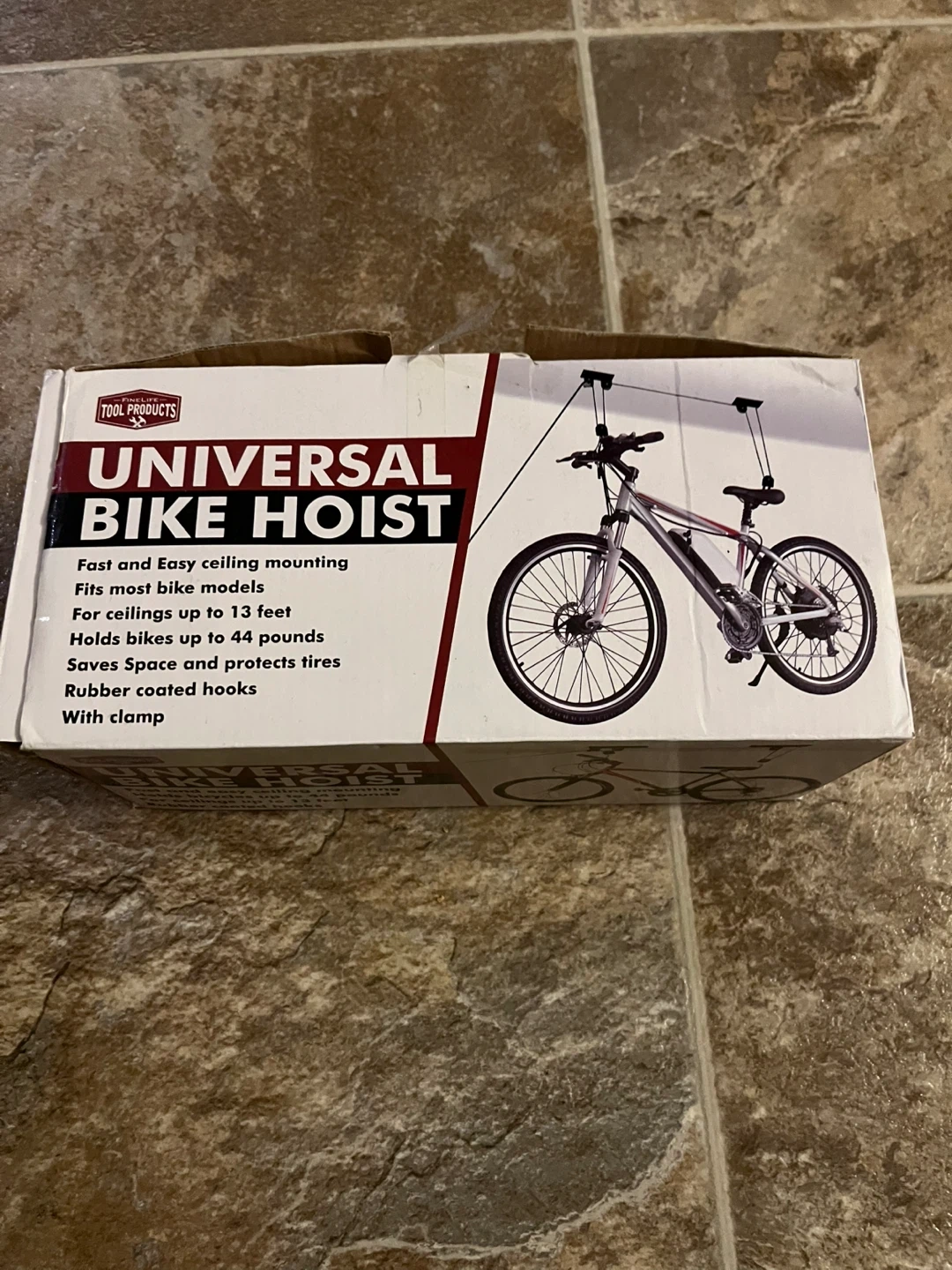 Selling a brand new Tool Products Universal Bike Hoist, still in its original box! It's designed for easy ceiling mounting and fits most bike models. This hoist can handle bikes up to 44 pounds and is suitable for ceilings up to 13 feet. It also features rubber-coated hooks and a clamp to protect your tires and save space