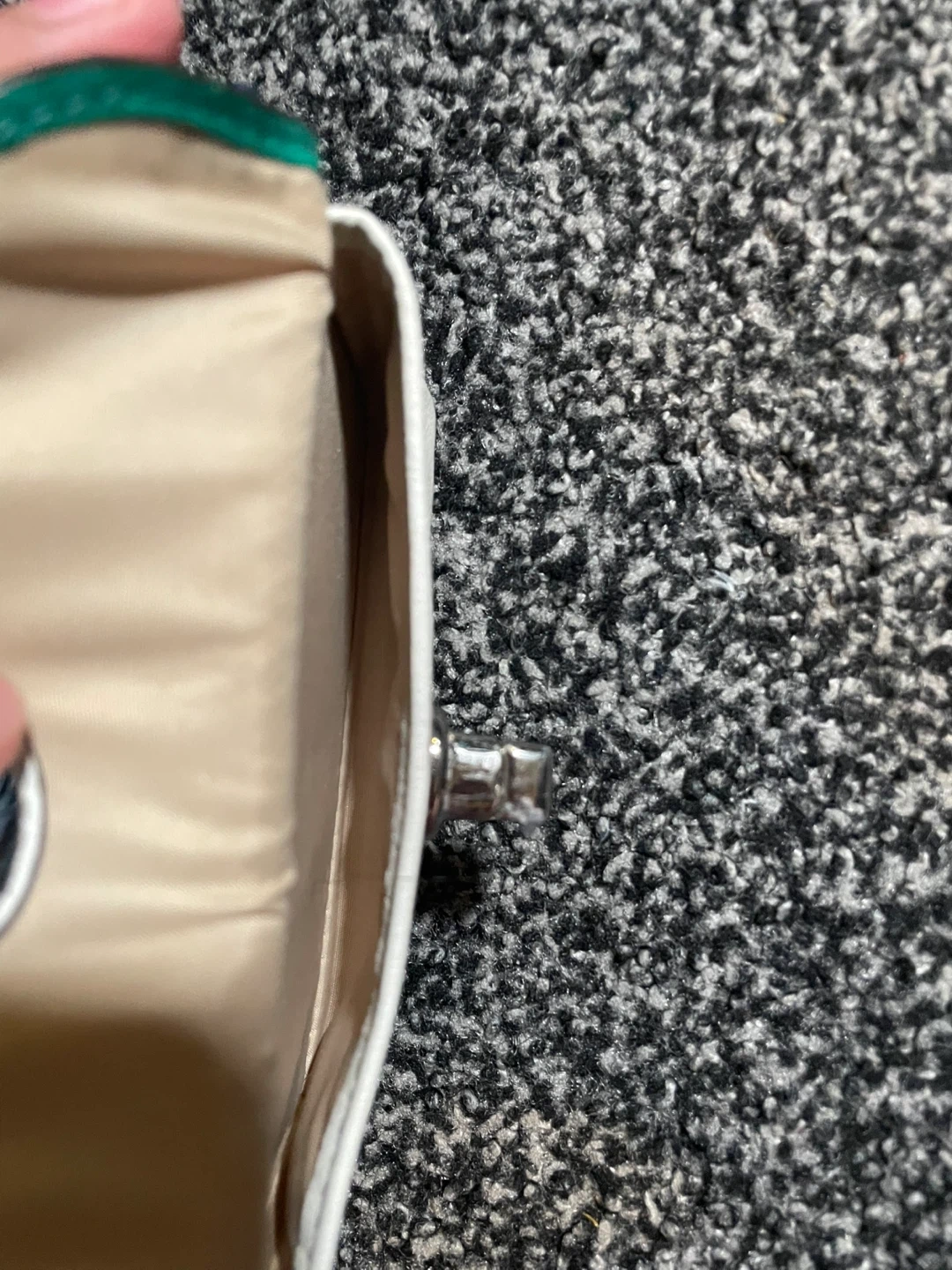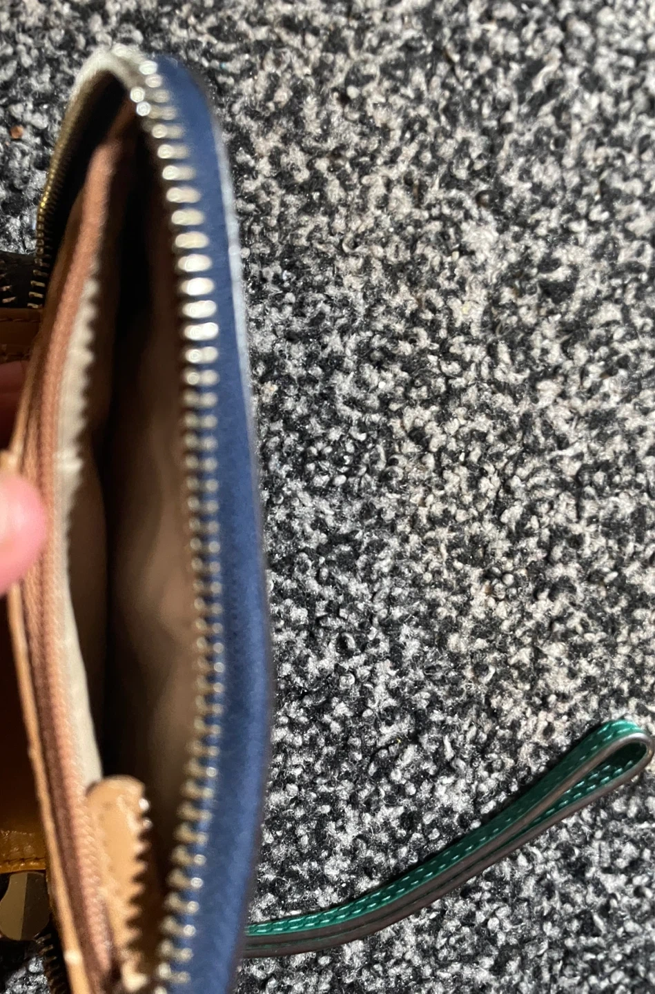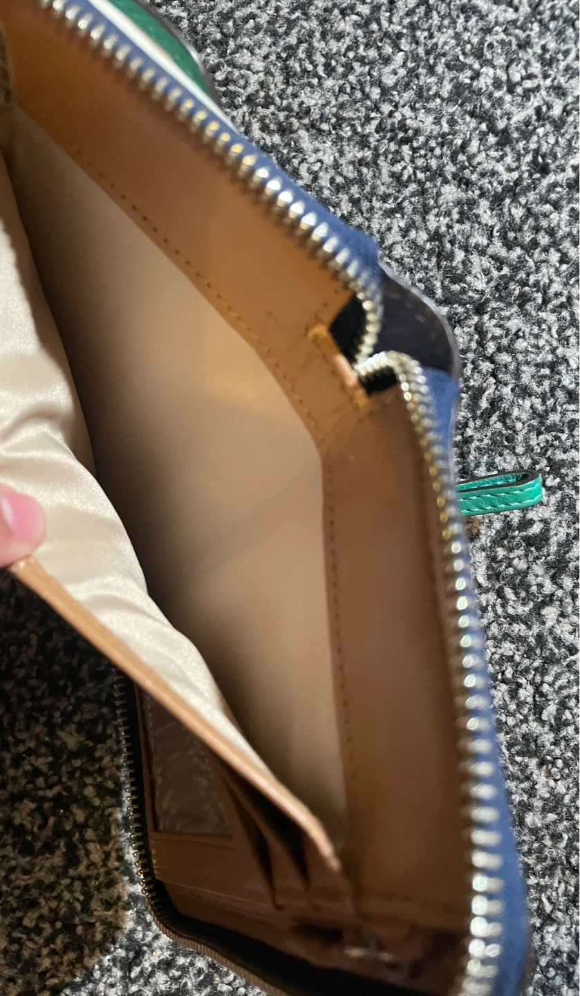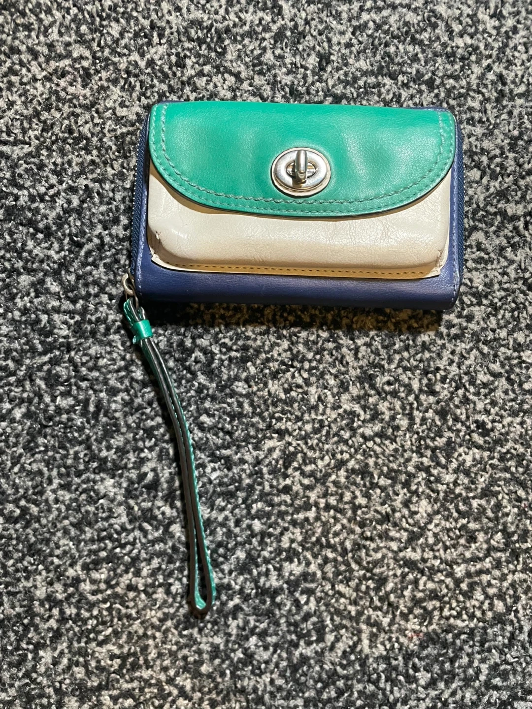 Selling a cute womens wallet! It's a mix of green, white, and blue. It has a zip closure and a wrist strap. Great for everyday use! It’s worn down and small spots of the leather is coming out. Has a lot of space for cards,money,coins, etc! I would be happy to get atleast 5 dollars out of it!