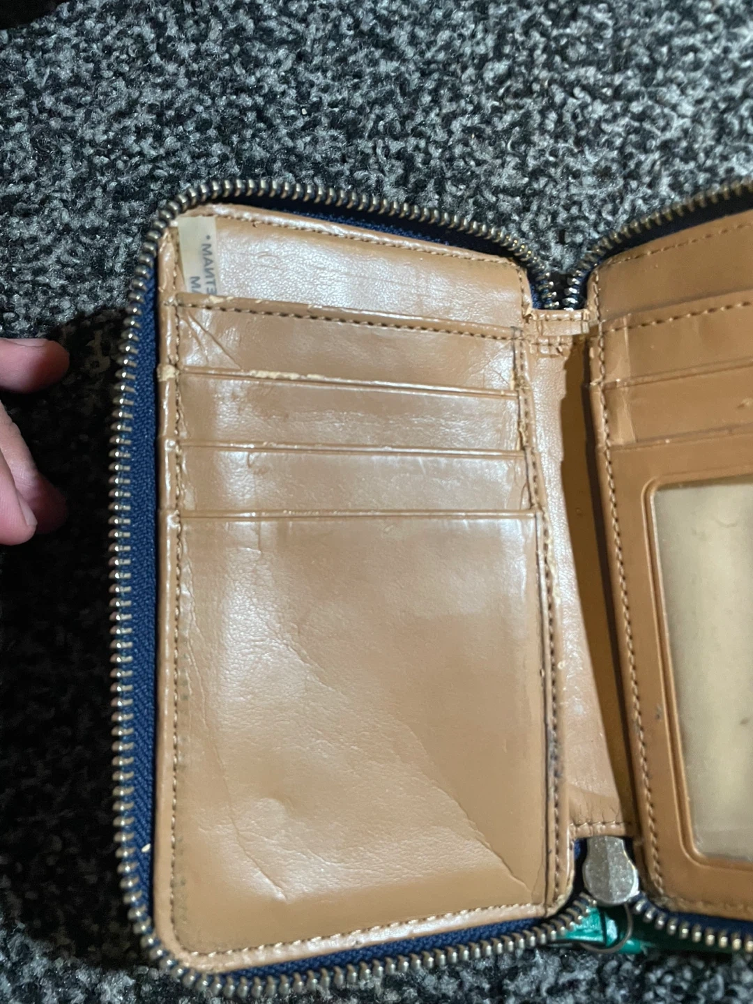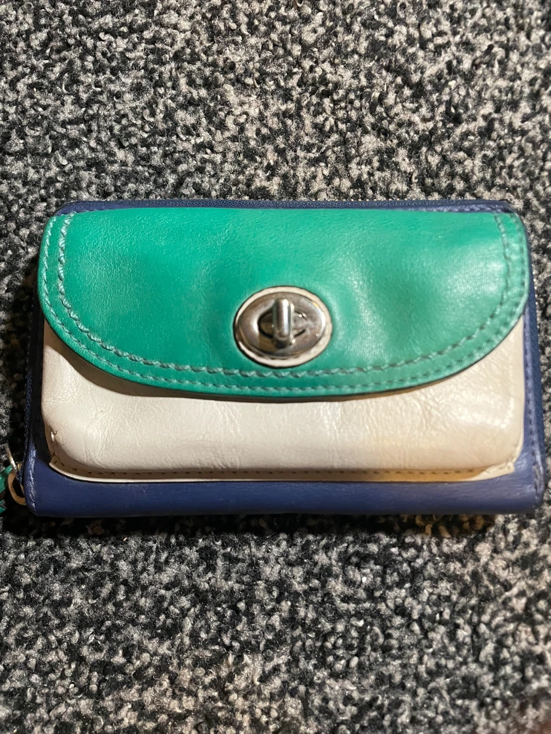 Selling a cute womens wallet! It's a mix of green, white, and blue. It has a zip closure and a wrist strap. Great for everyday use! It’s worn down and small spots of the leather is coming out. Has a lot of space for cards,money,coins, etc! I would be happy to get atleast 5 dollars out of it!