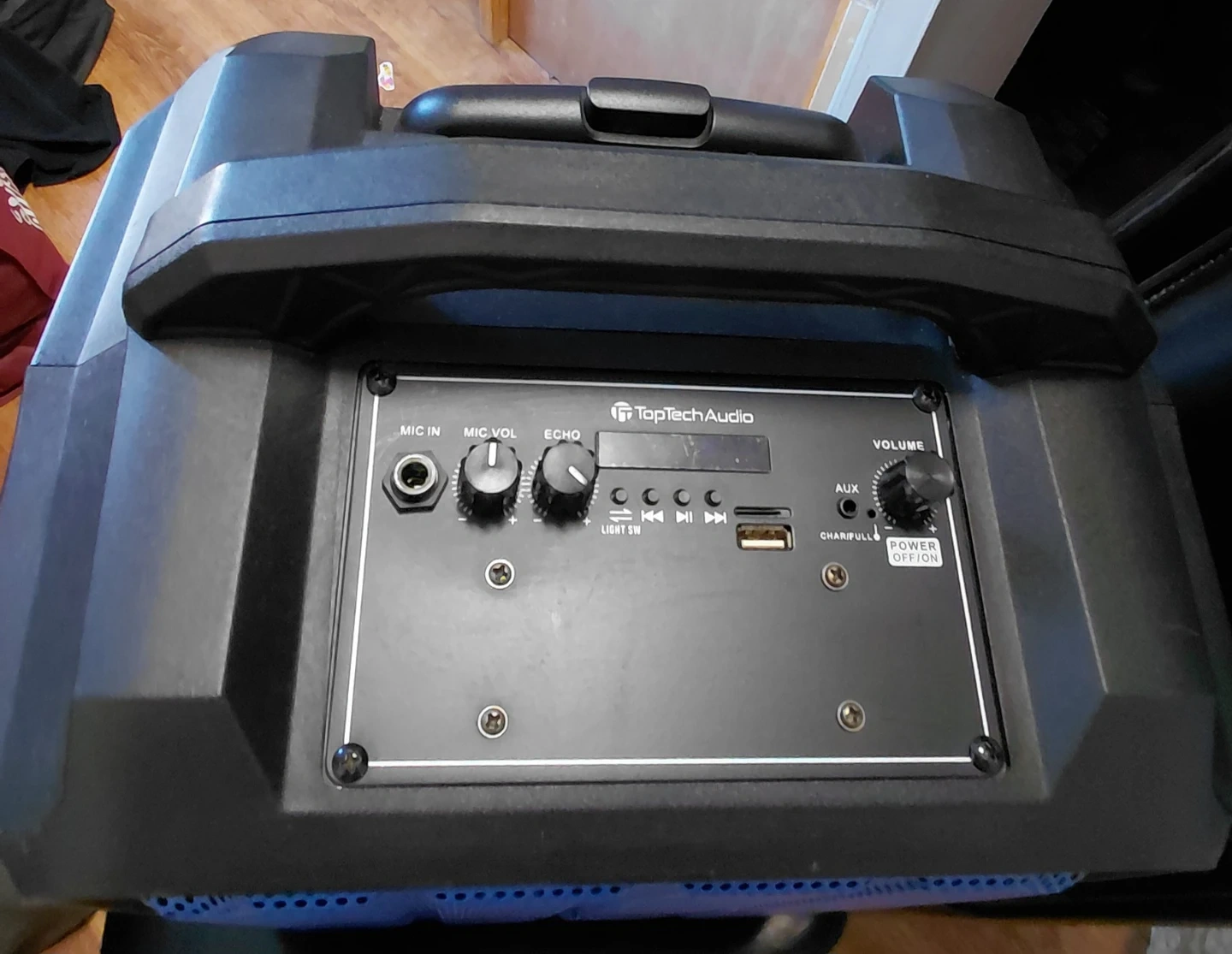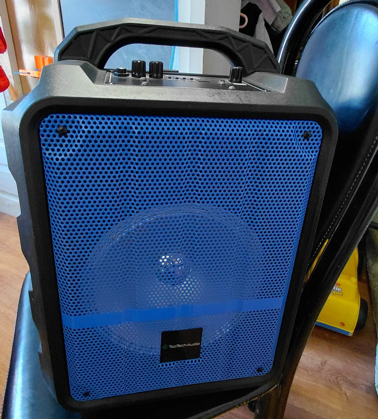 Selling a TopTechAudio portable Bluetooth speaker. It's in good condition and ready for a new user. It has a handle for easy carrying and a blue grill over the speaker.