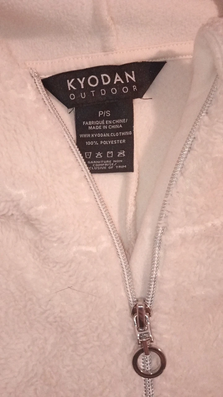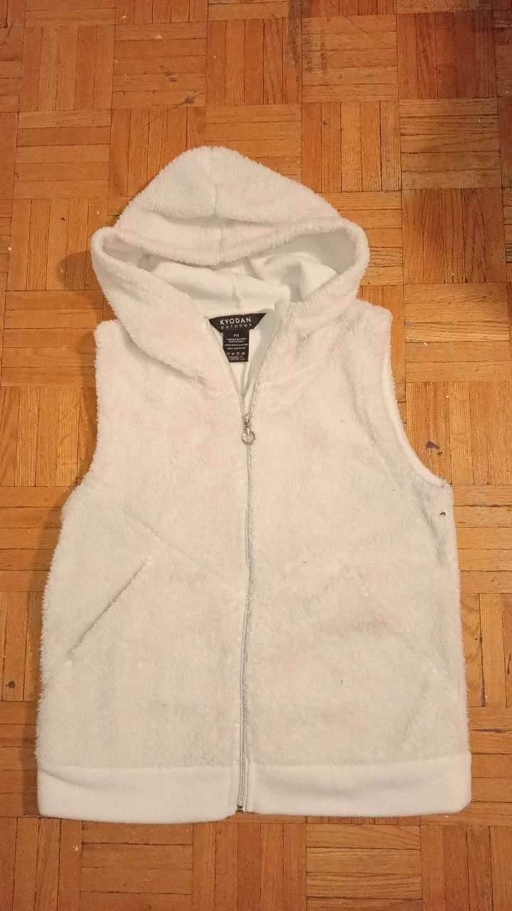 Here's a cozy white hooded vest from Kyodan Outdoor! It's a size P/S and made of 100% polyester. Perfect for layering on those chilly days!