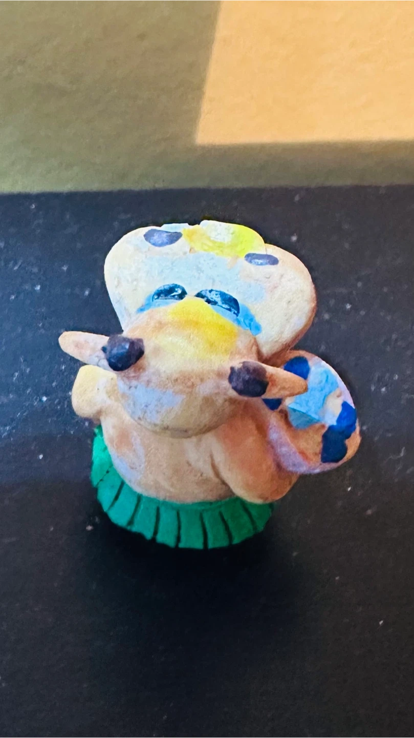 This is a handmade cow figurine, perfect for adding a touch of whimsy to your space! It features a cute design with vibrant colors and a unique, handcrafted feel